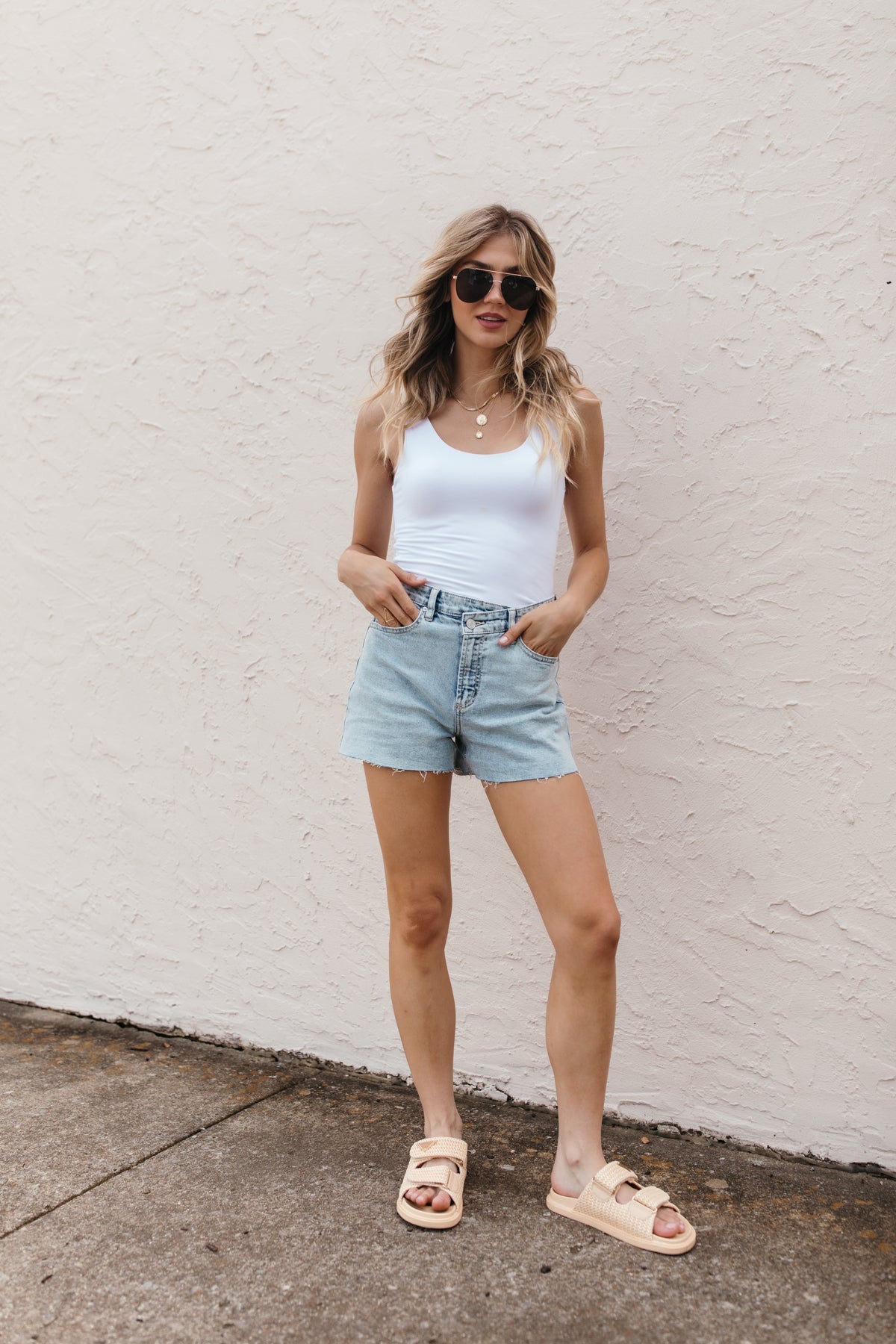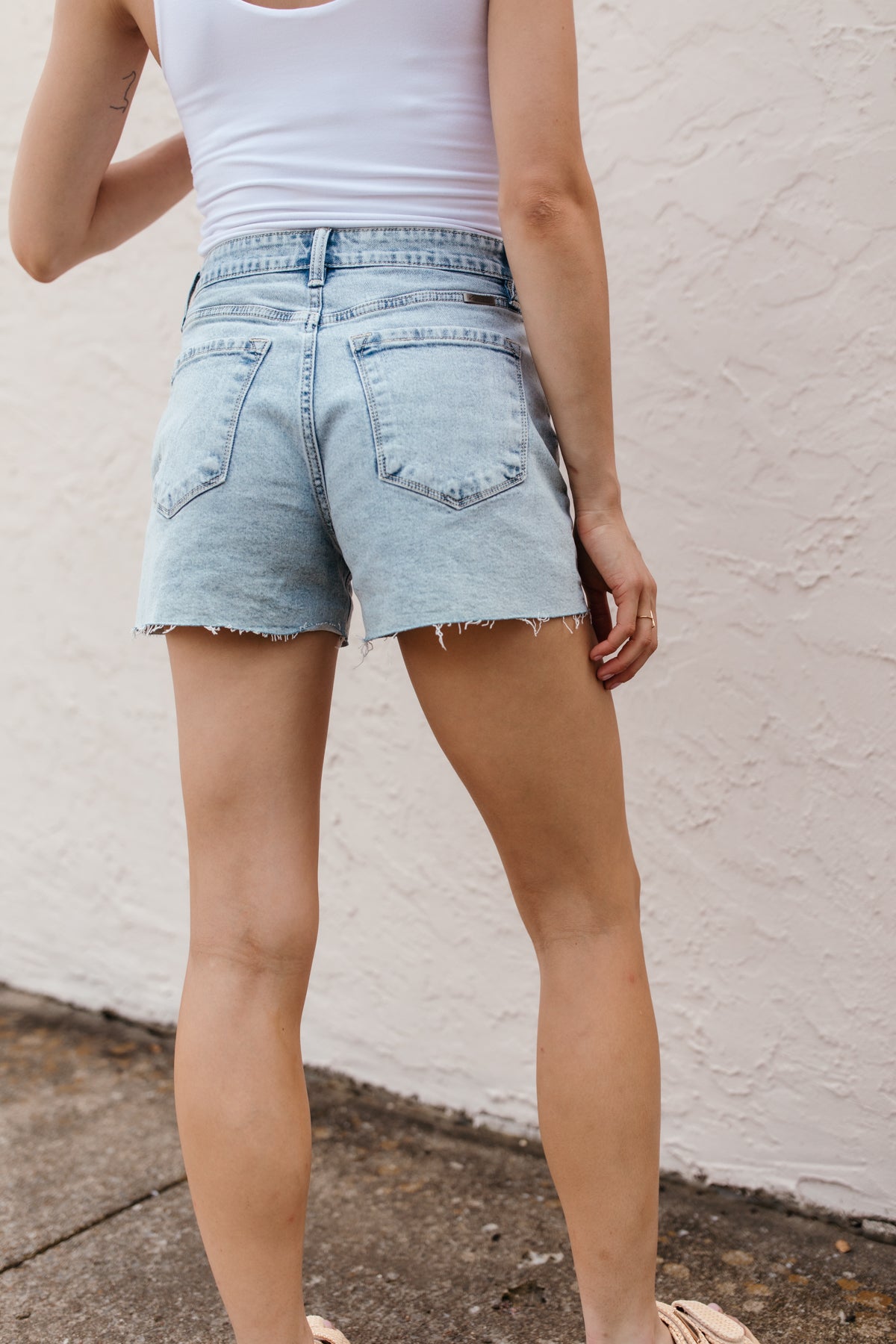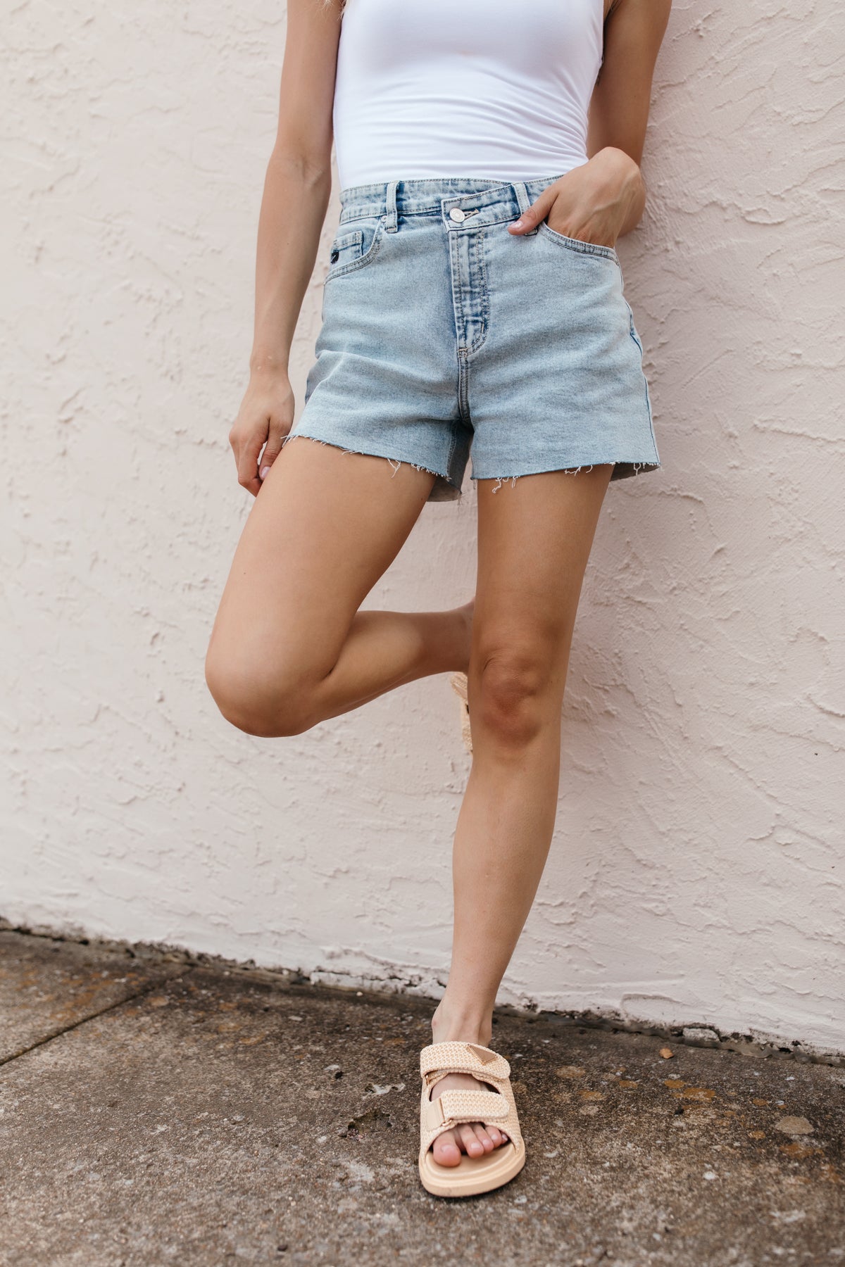 Our Asymmetrical Denim Shorts feature a high rise waist, raw hem and an asymmetrical button closure.