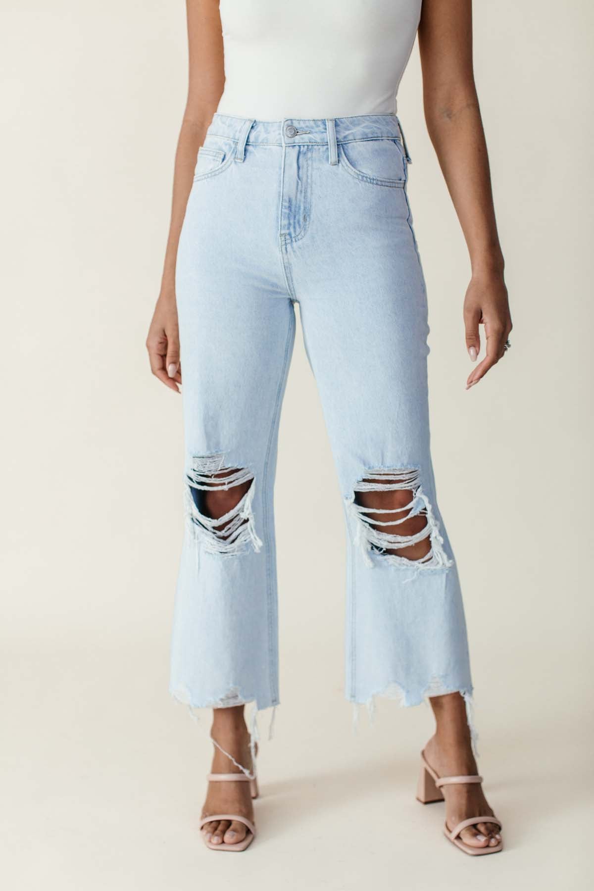 Our Avery Distressed Cropped Flares provide an effortlessly chic look, made from lightweight denim fabric with a relaxed fit for day-long comfort. Featuring a mid-rise waist and cropped length, detailed with distressed accents, plus convenient side pockets and a button and zip closure.