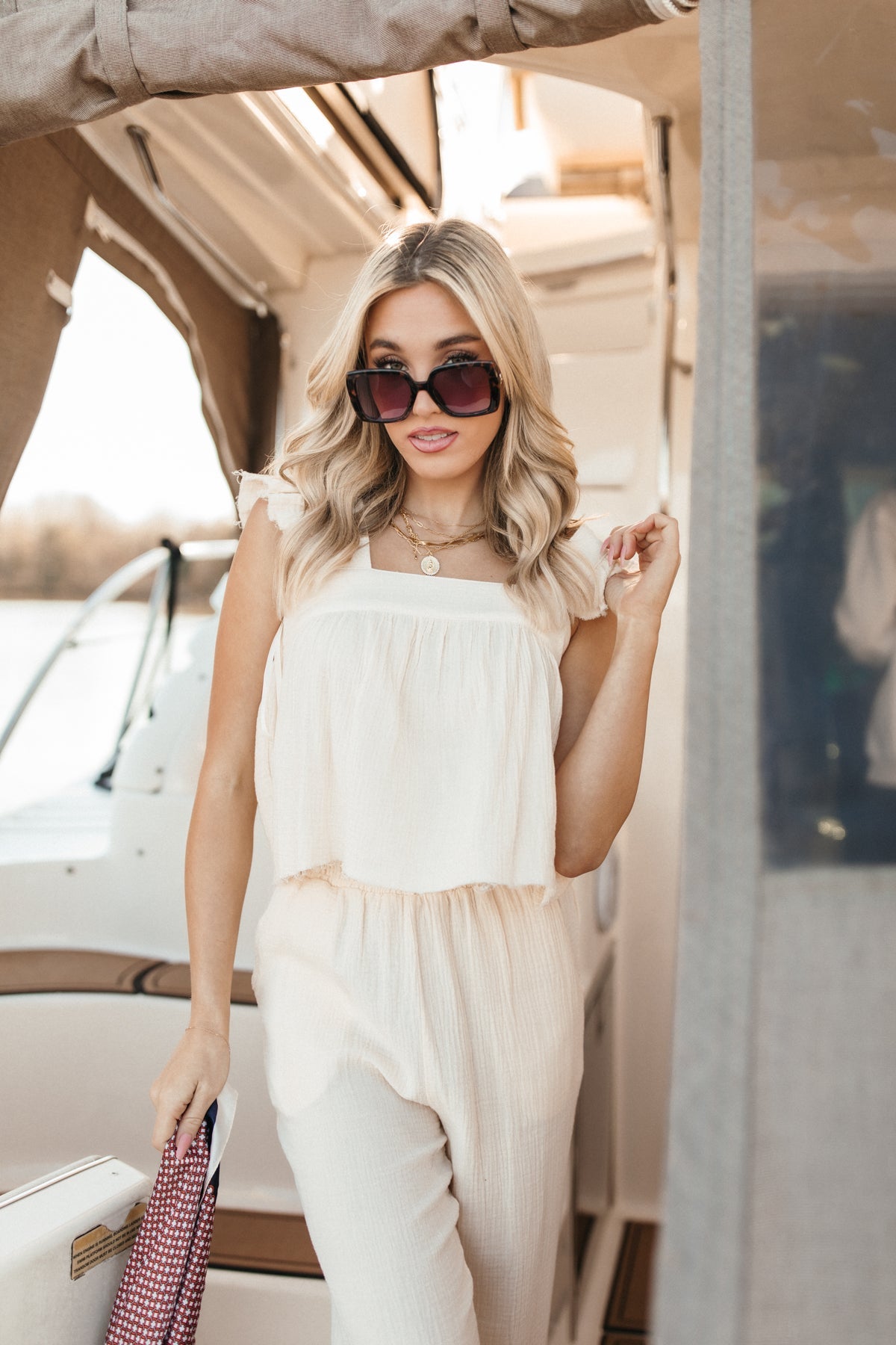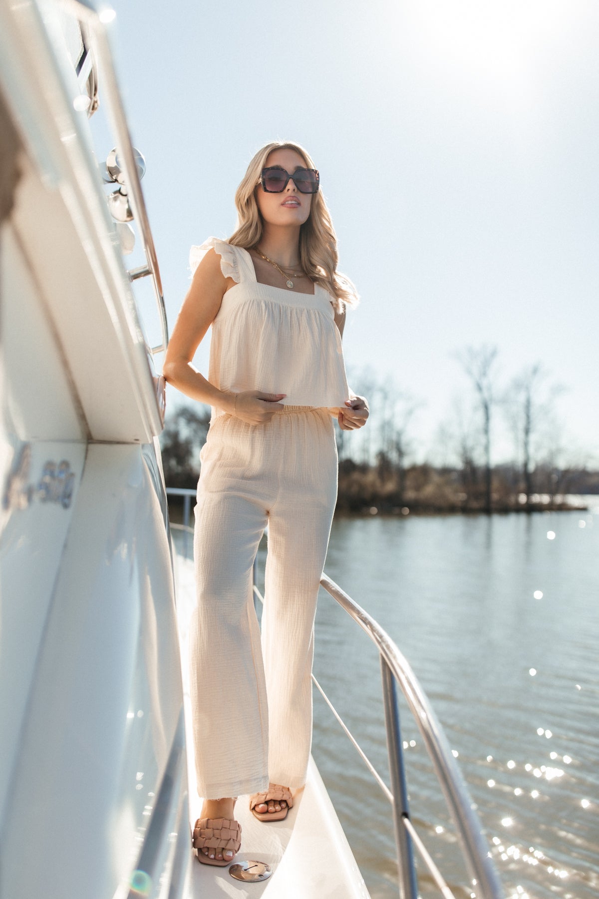 Our Eliana Linen Set features a lightweight linen material. It comes with a tank top with a square neck & ruffle sleeves. The linen pantsfeature an elastic waistband and two side pockets.