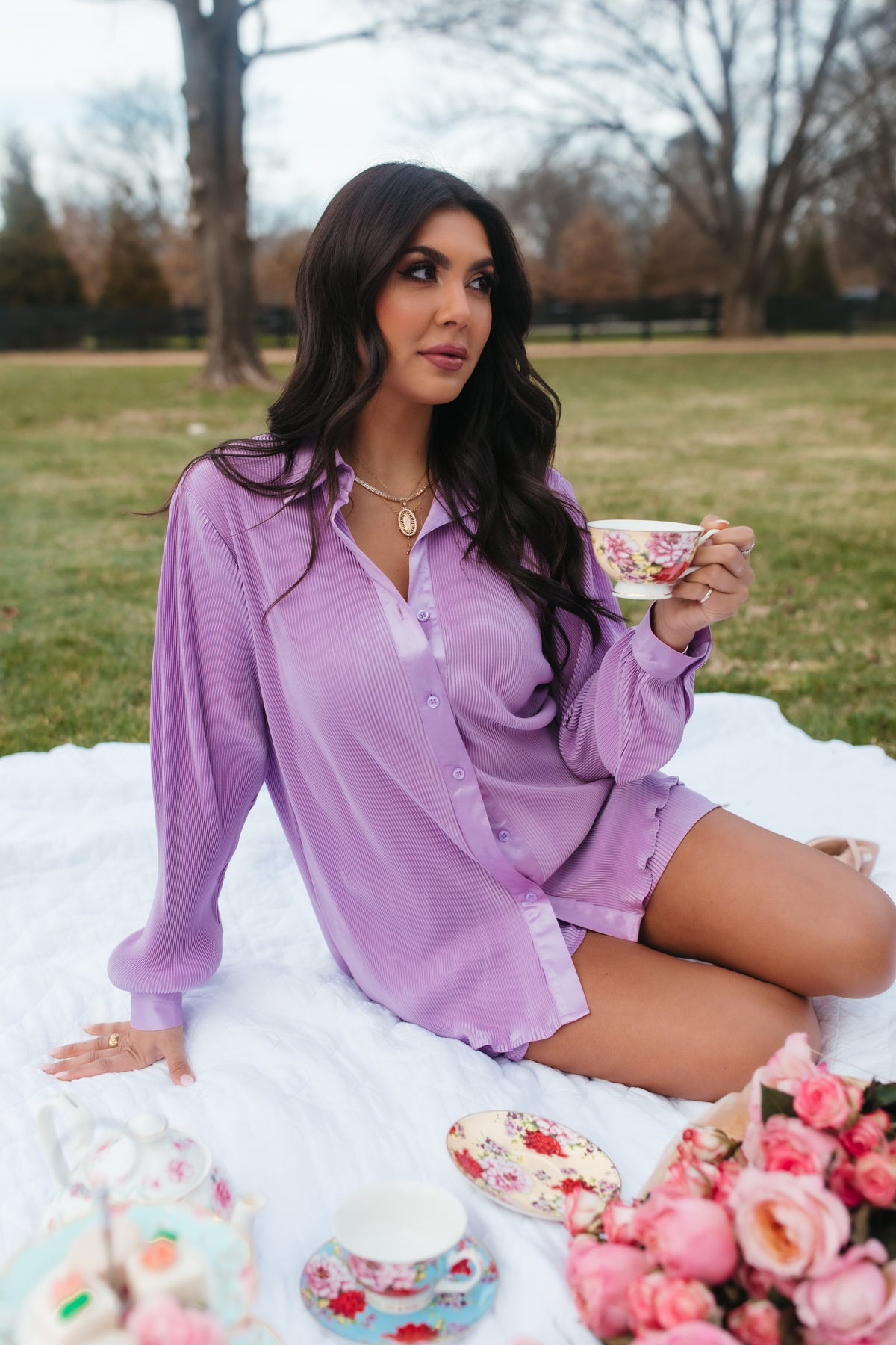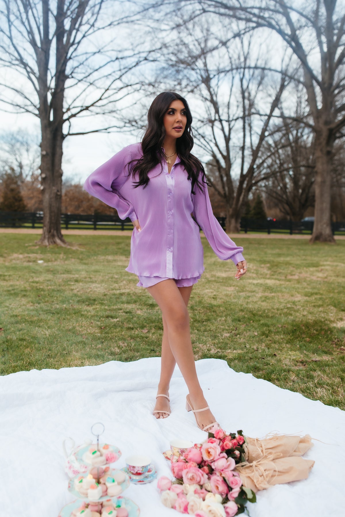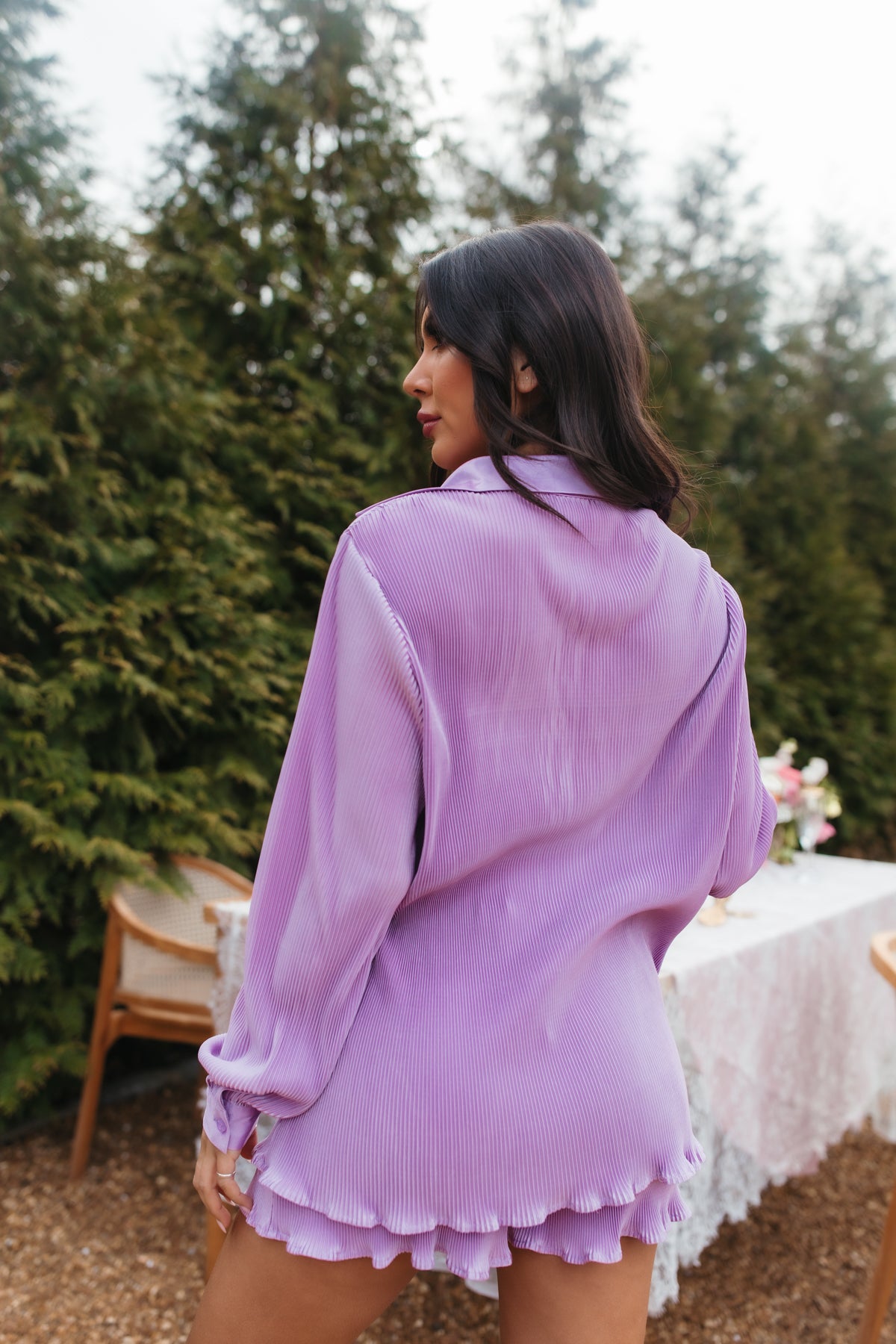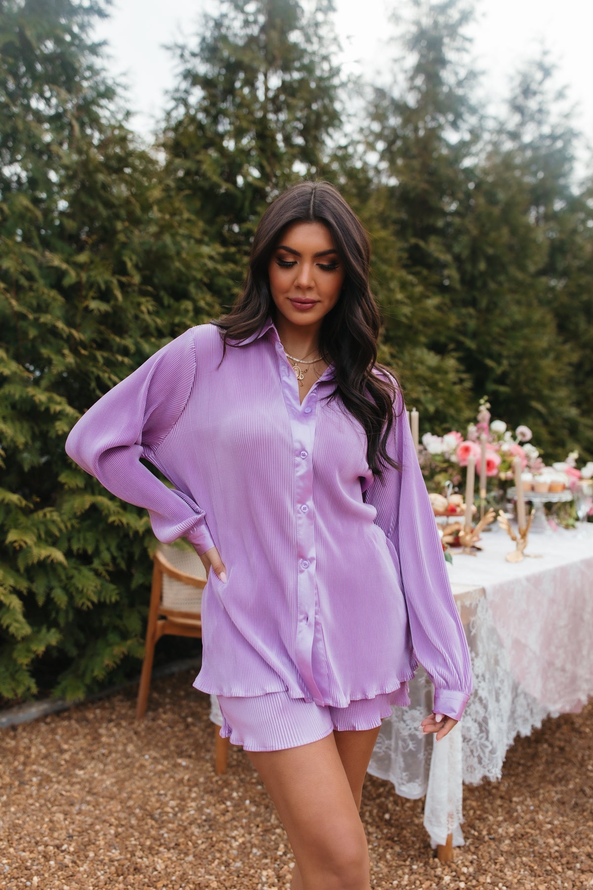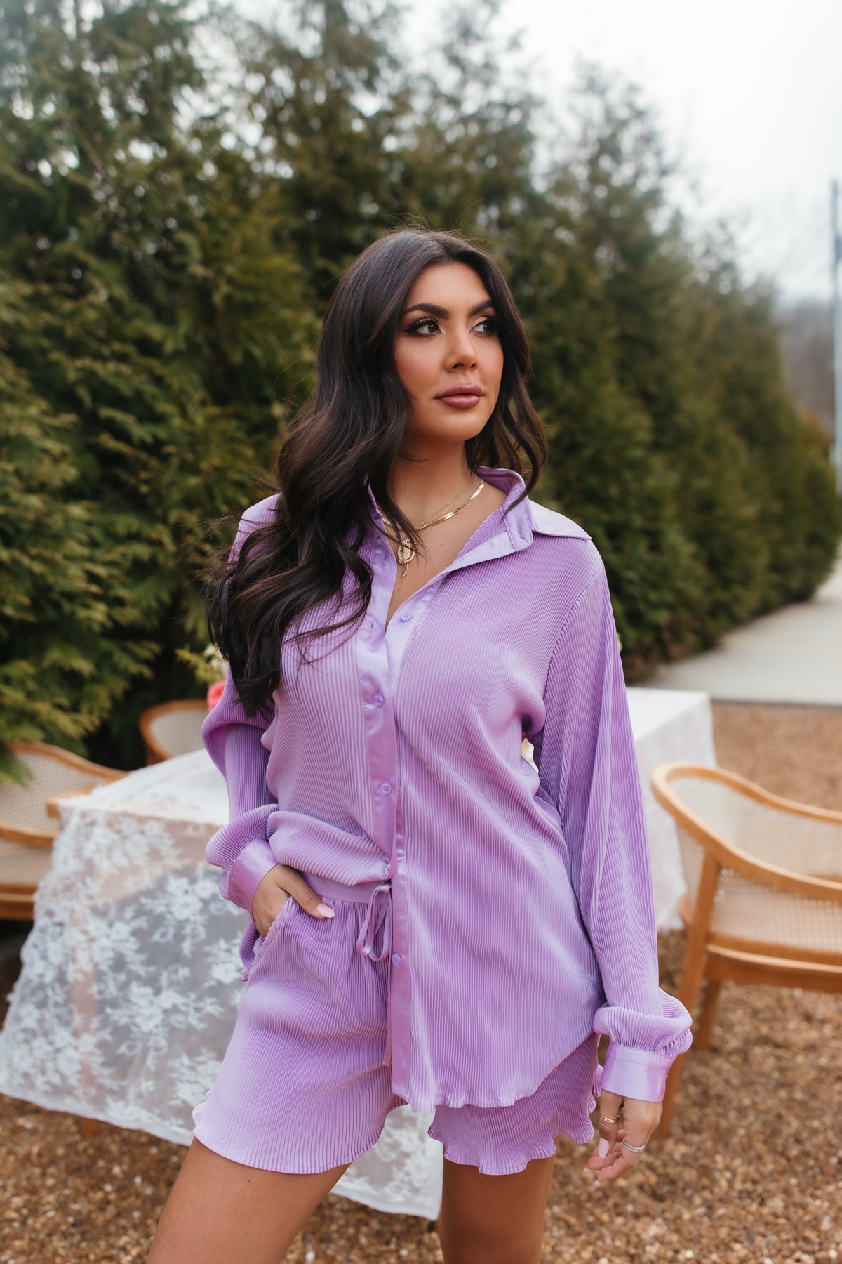 Our KennaLavender Setis designed witha plissè finish. Theset has a button-down top, along with shorts featuring a drawstring tie and pockets.