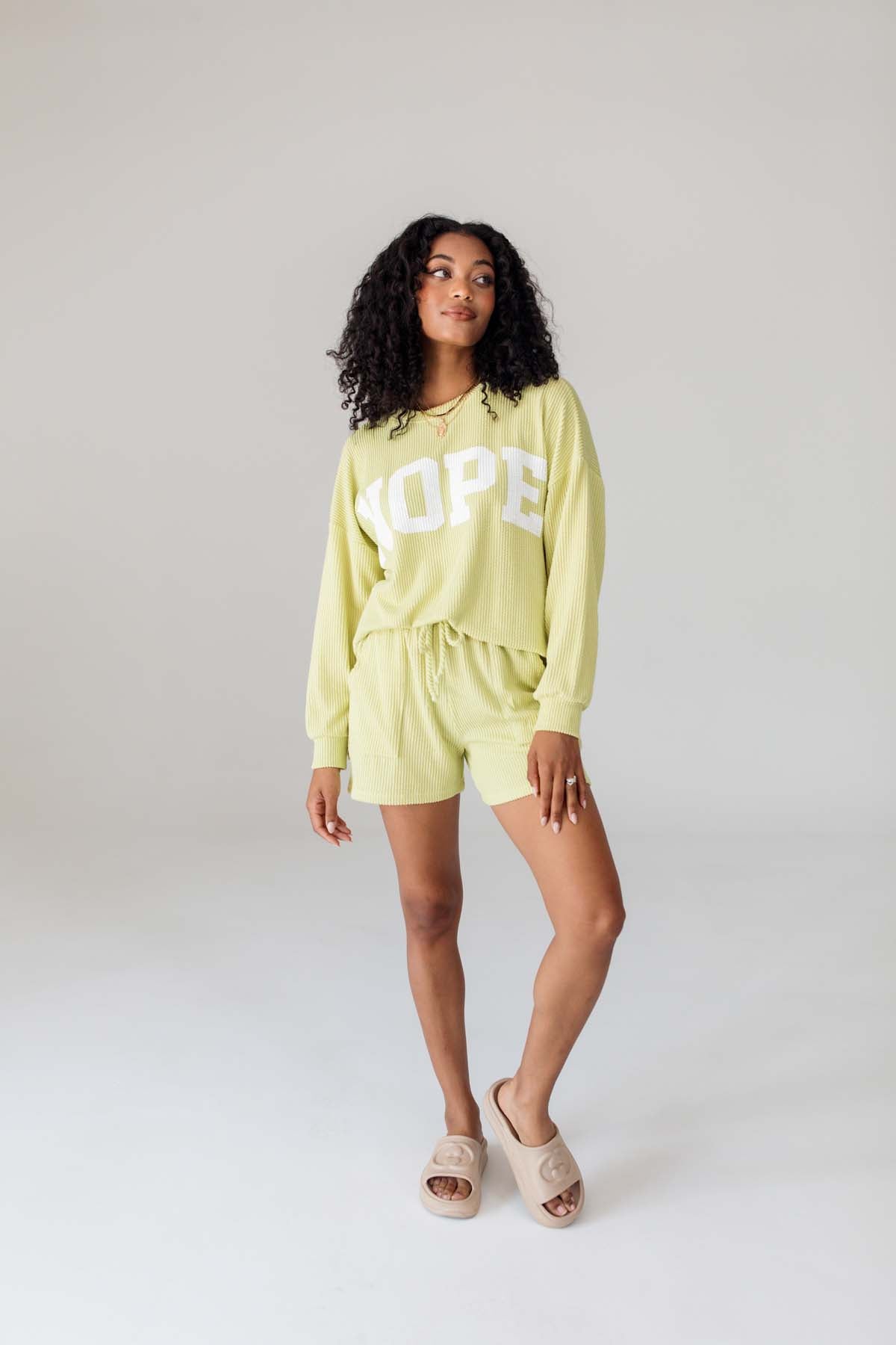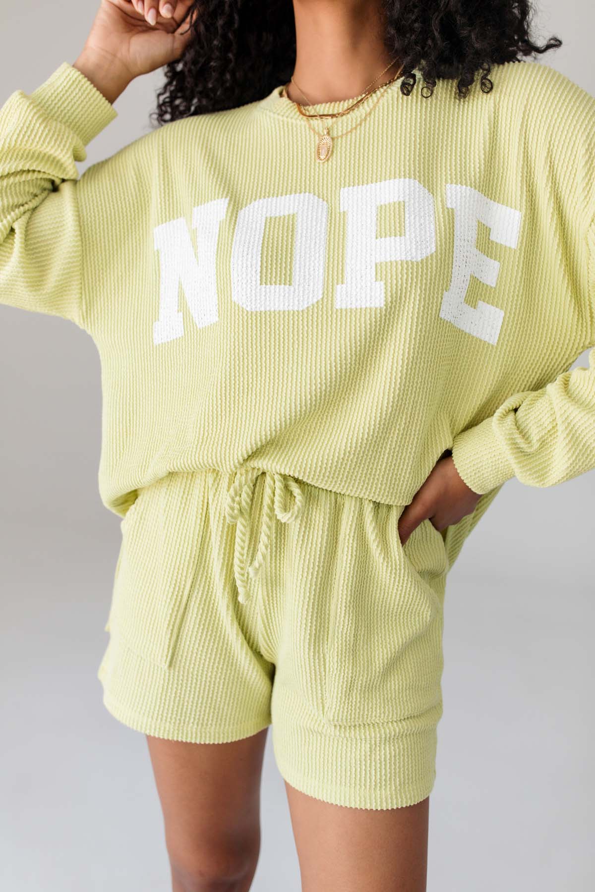 Our Nope CordedSet features a corded sweatshirt with ‘Nope’ text and matching corded drawstring shorts with side pockets.
