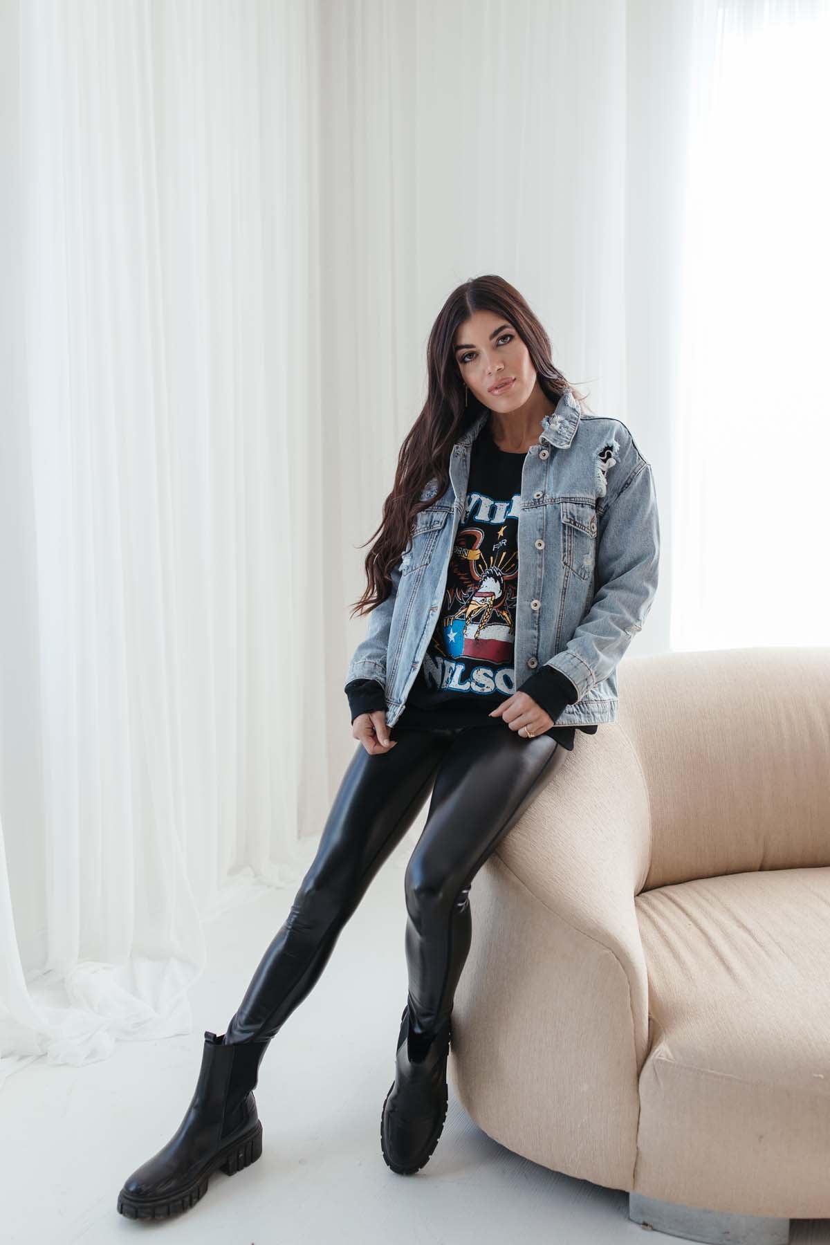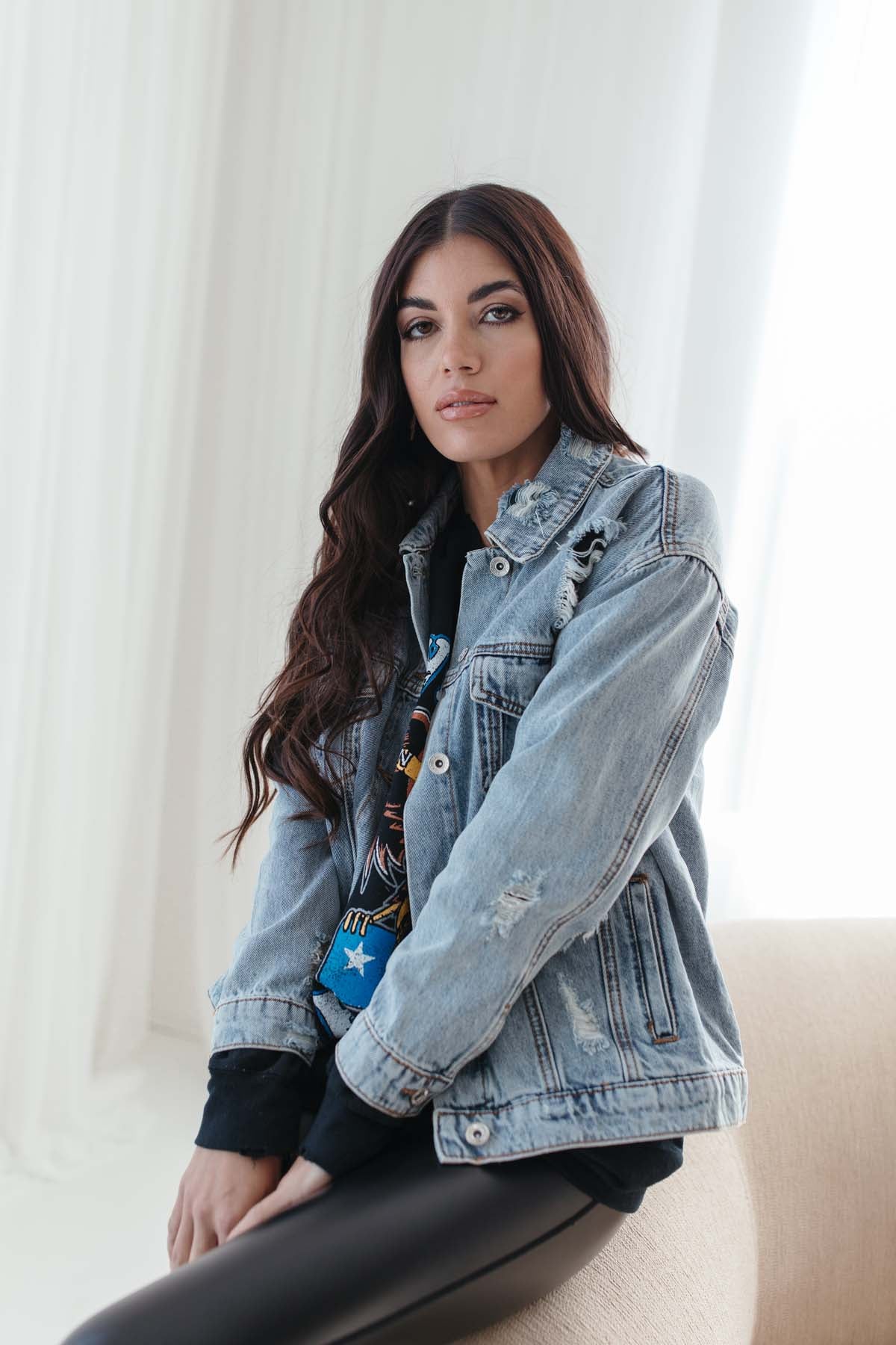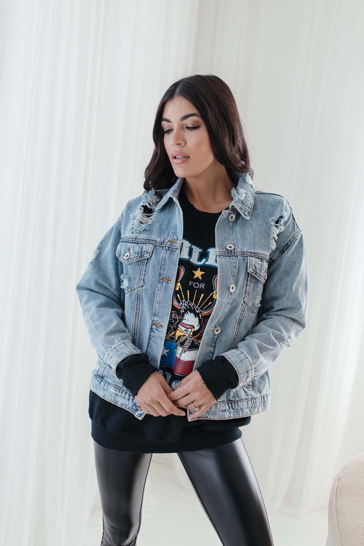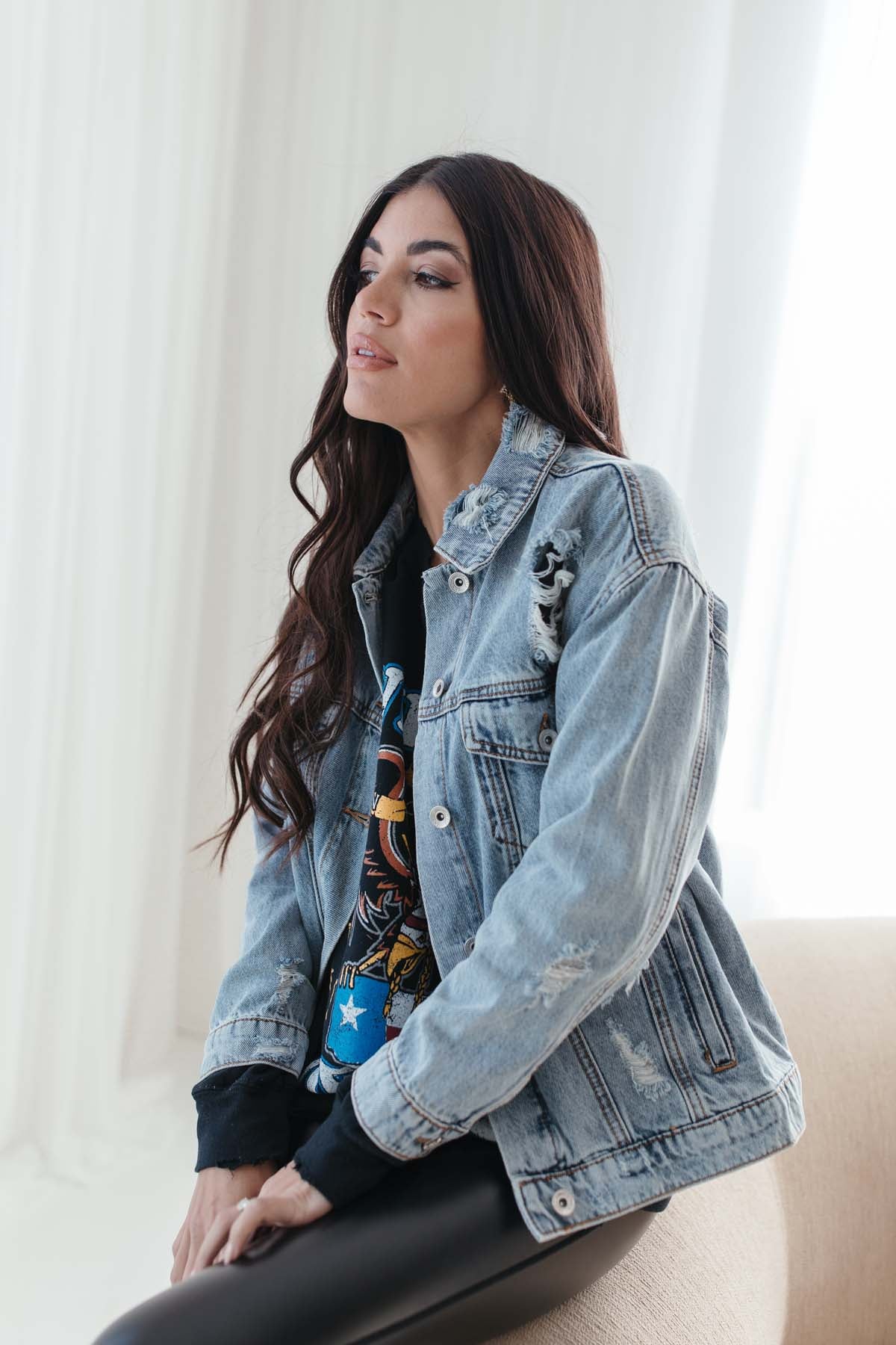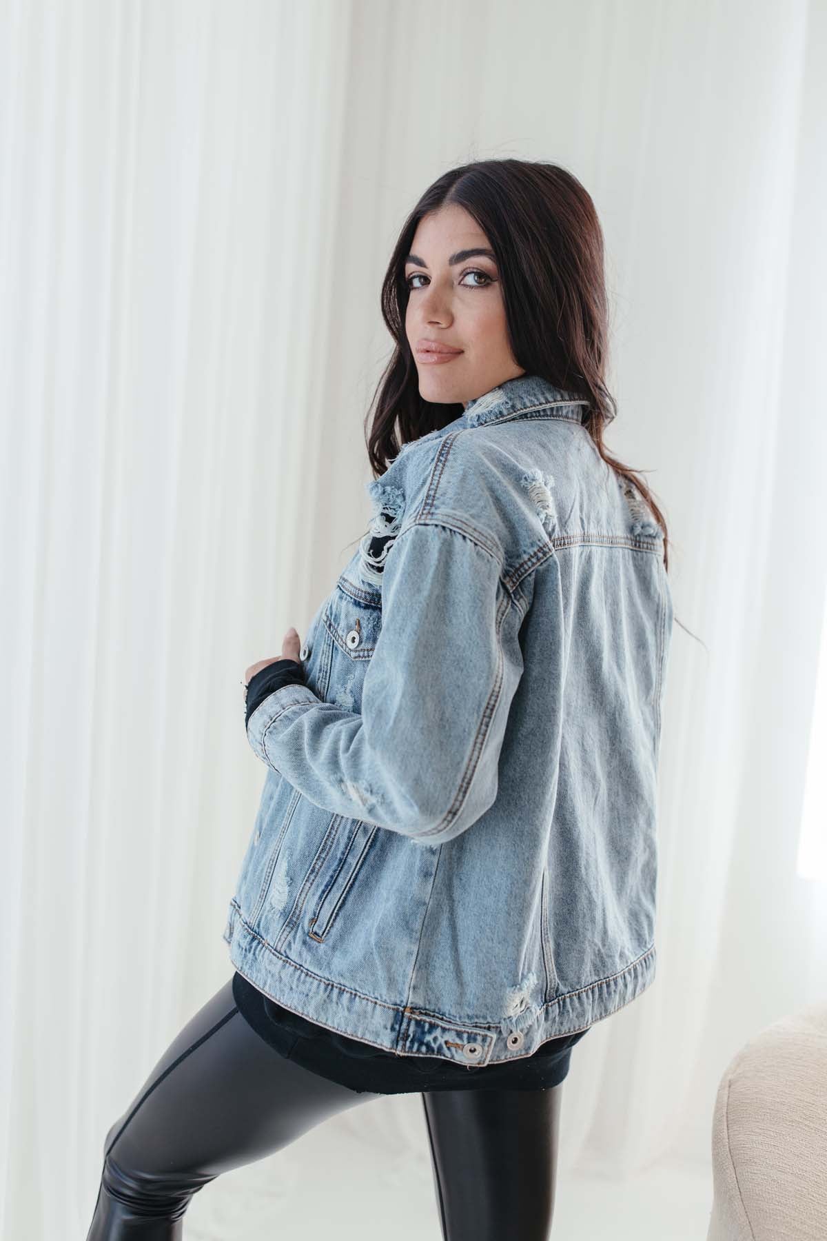 Our Ariana Distressed Denim Jacket featuresa relaxed fit and distressing.