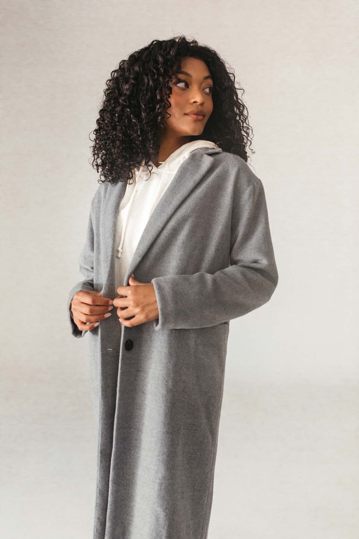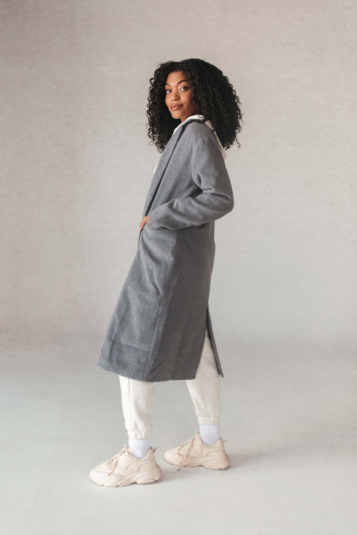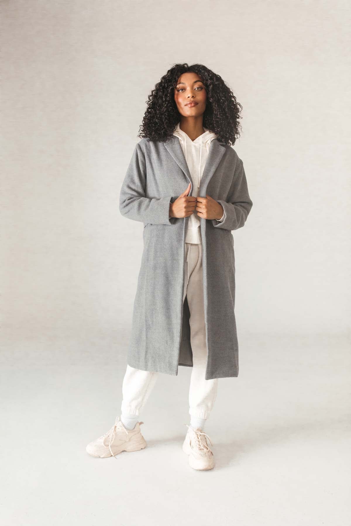 Our Iris Gray Trench Coat features a soft, wool-blend fabric and two side pockets.