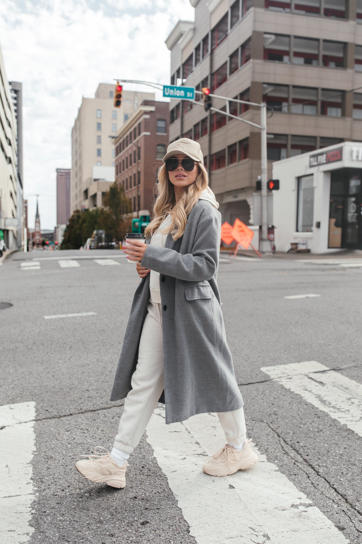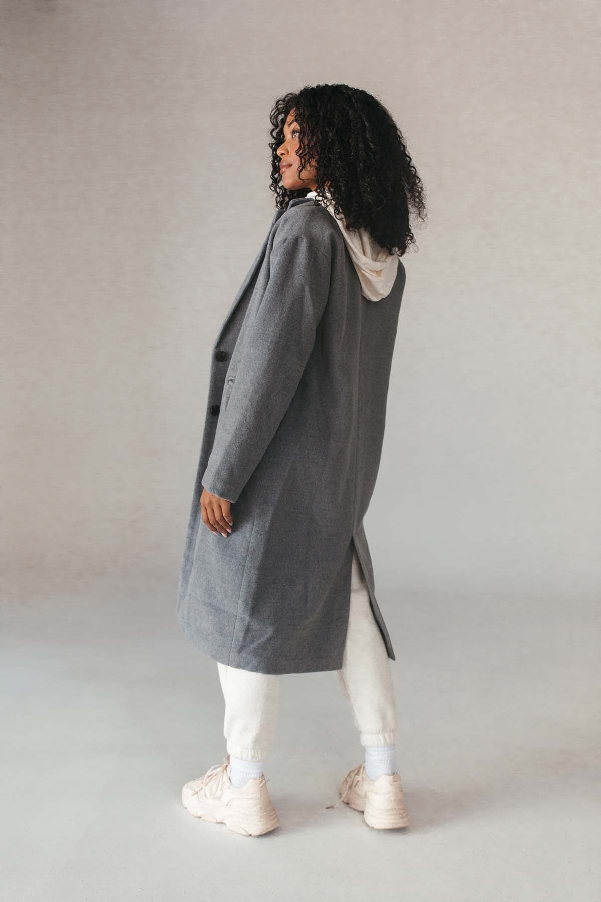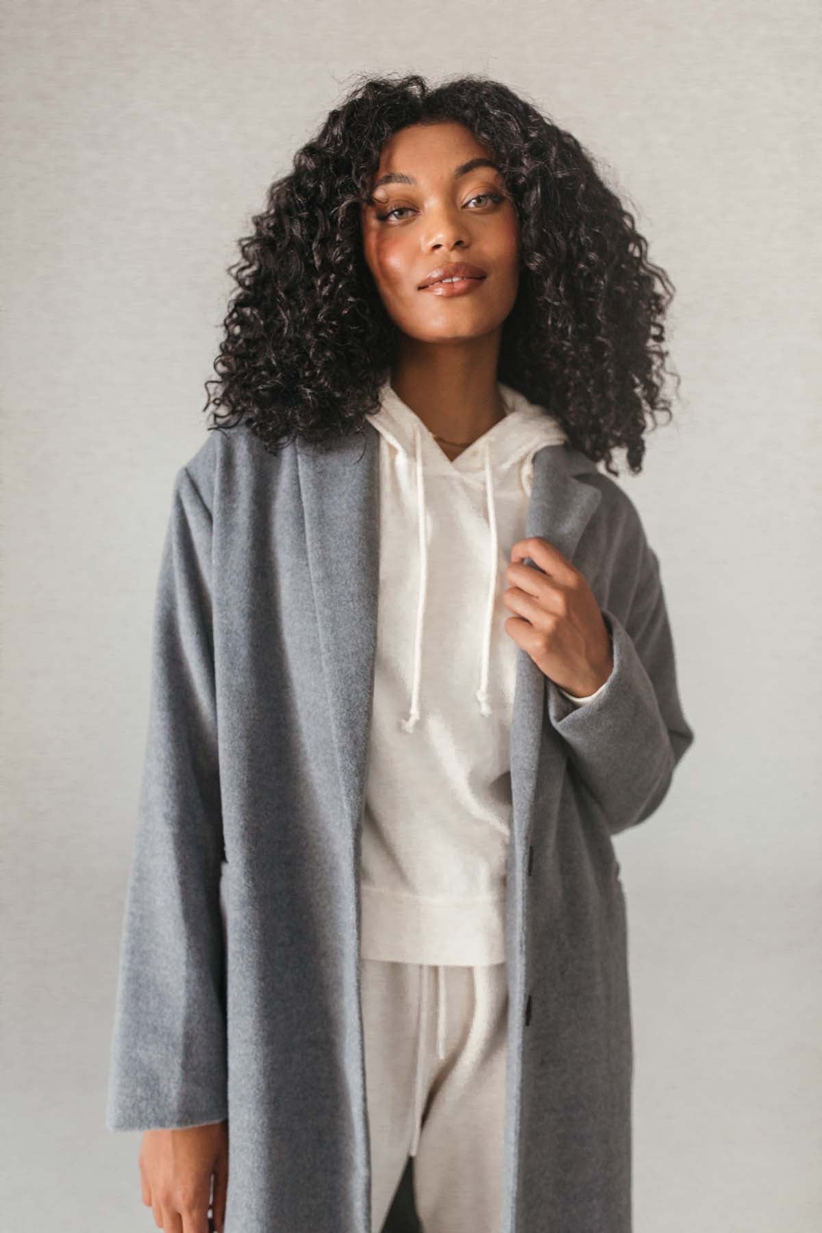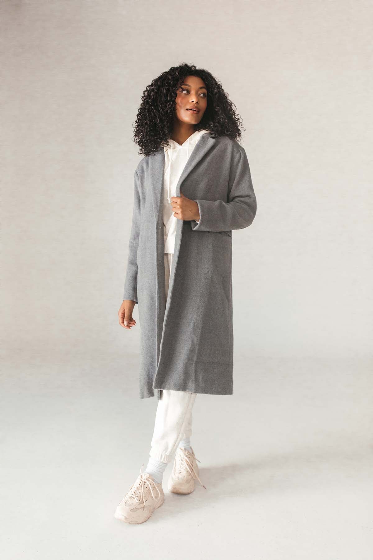 Our Iris Gray Trench Coat features a soft, wool-blend fabric and two side pockets.