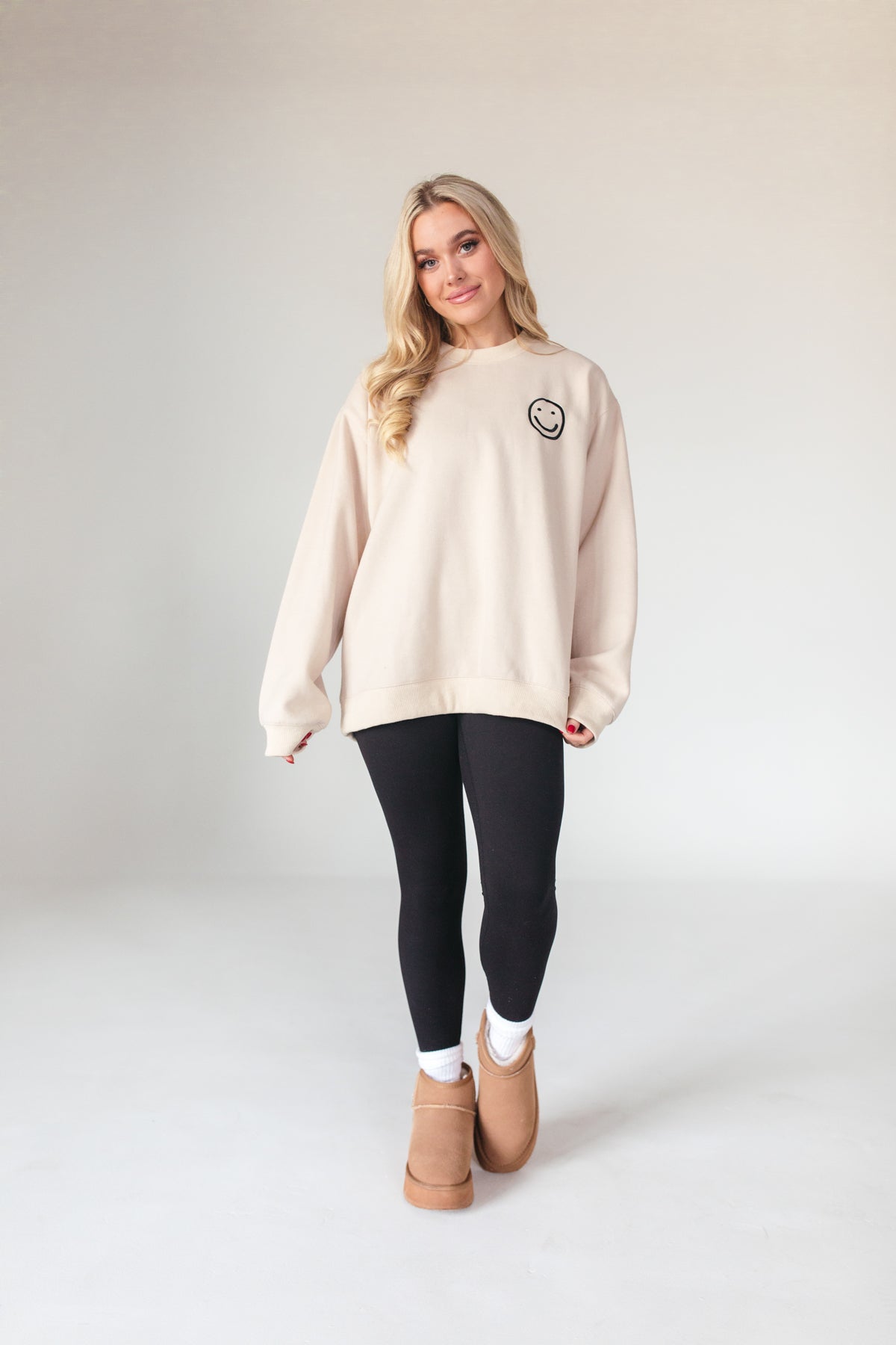 OurHappy Sweatshirt features an embroidered smiley graphic and ribbed hems.