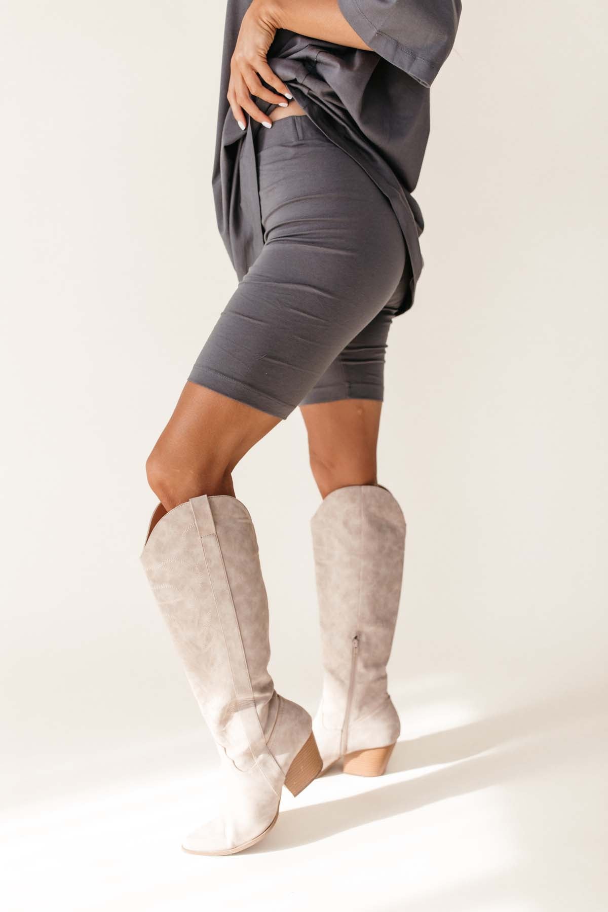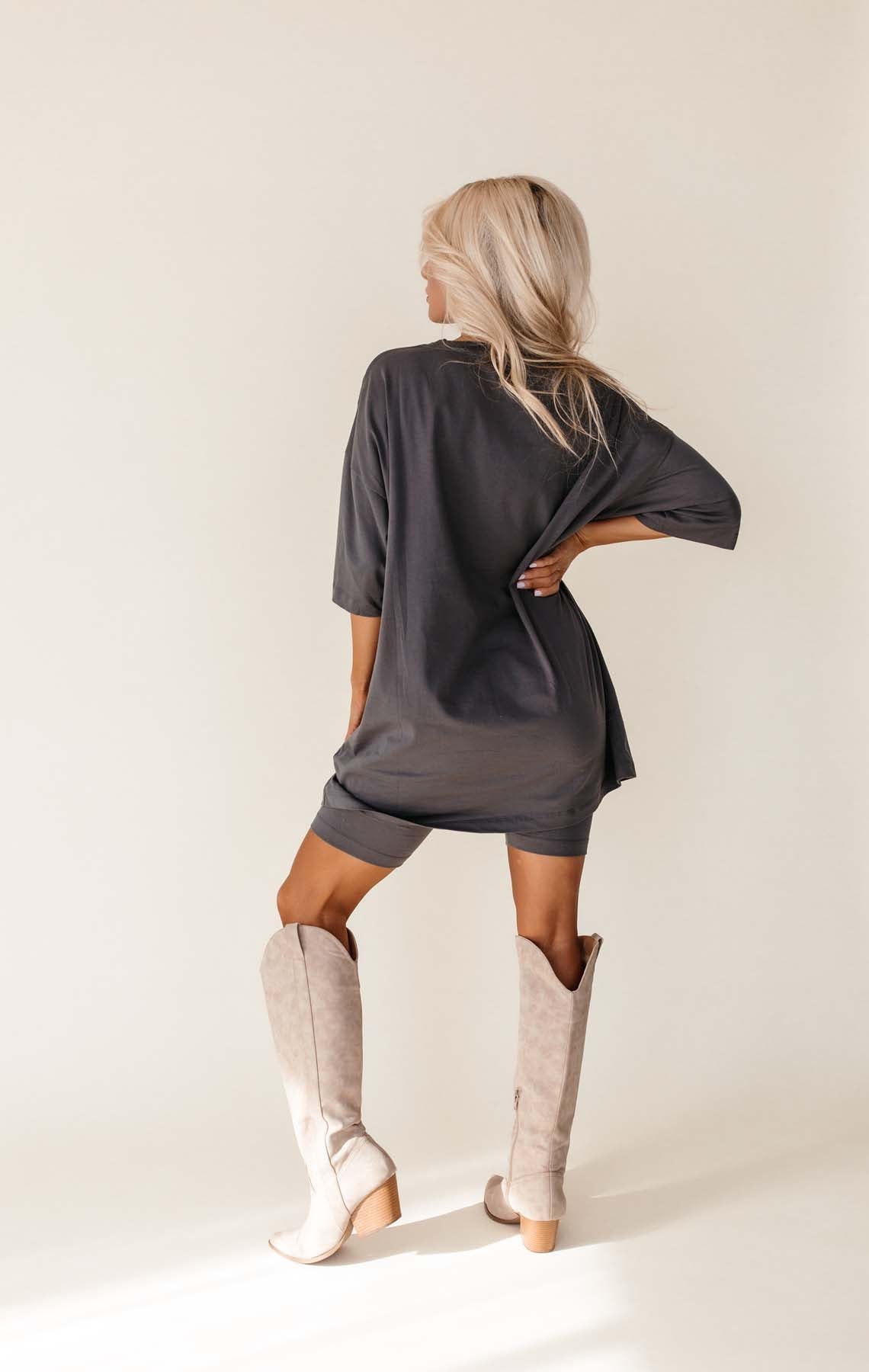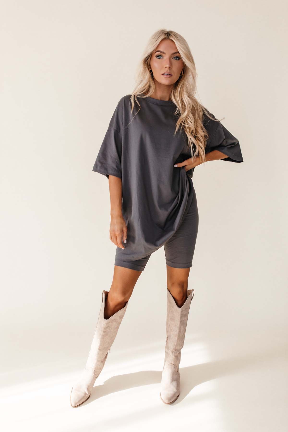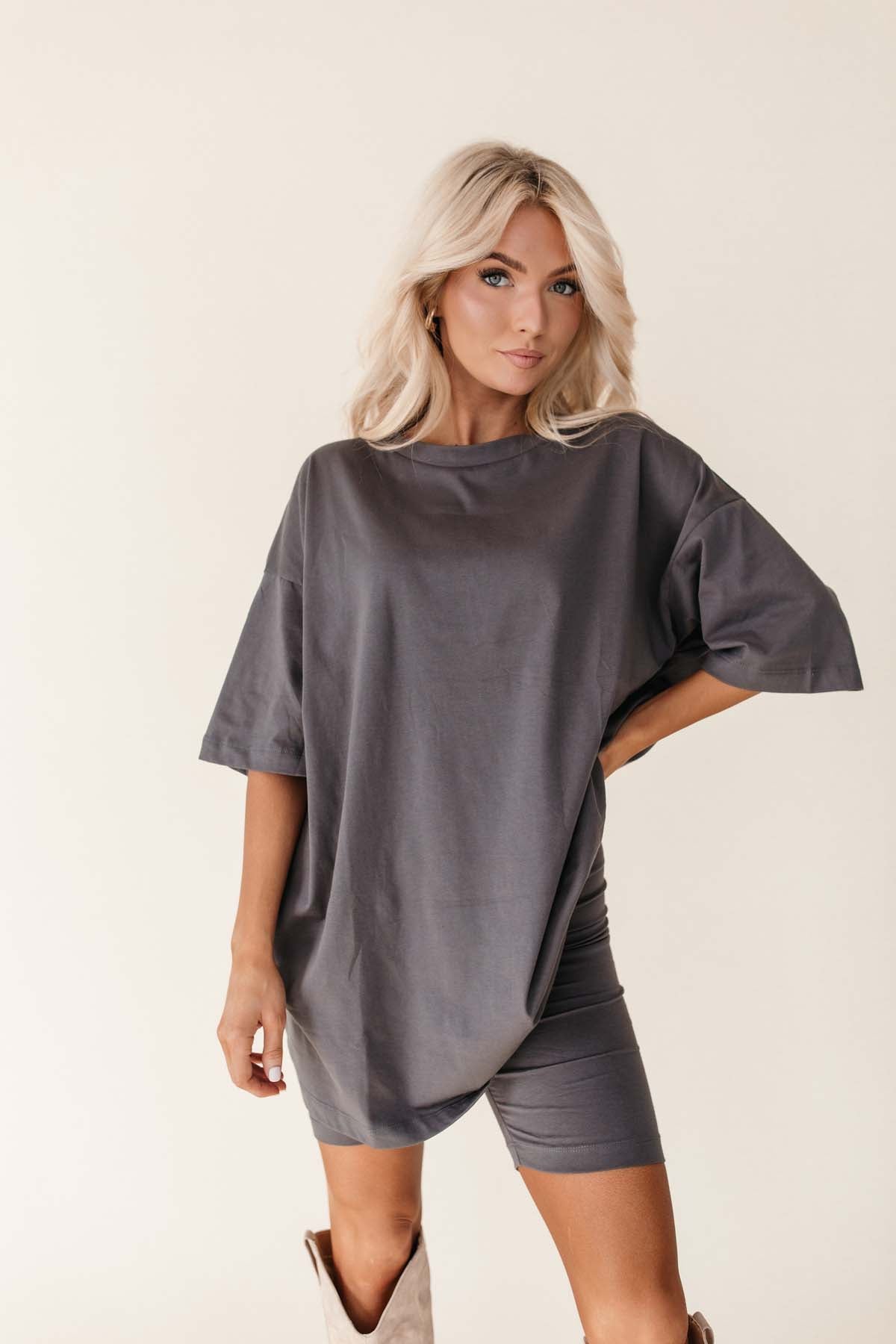Our Harmony Charcoal Oversized Tee & Biker Short Set includes a comfortable t-shirt and biker shorts with an elastic waistband.