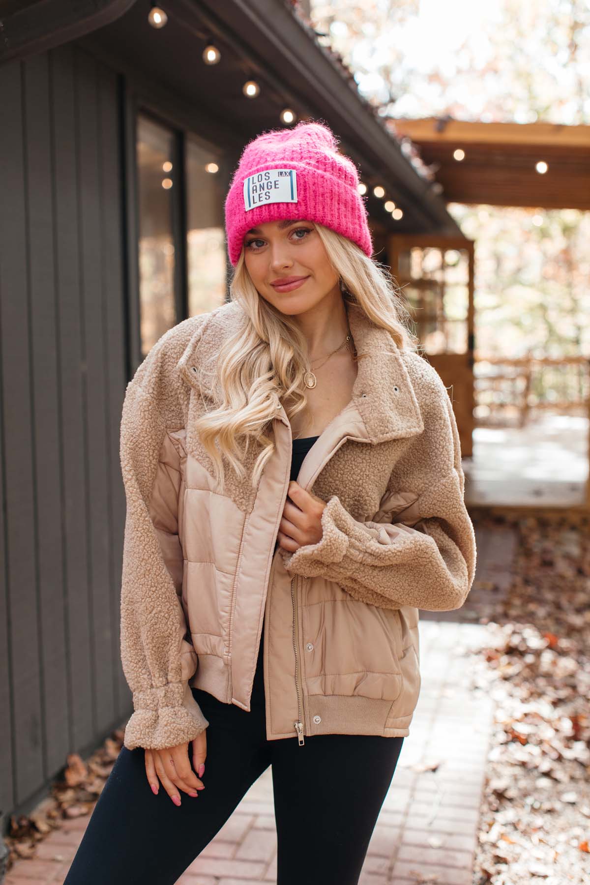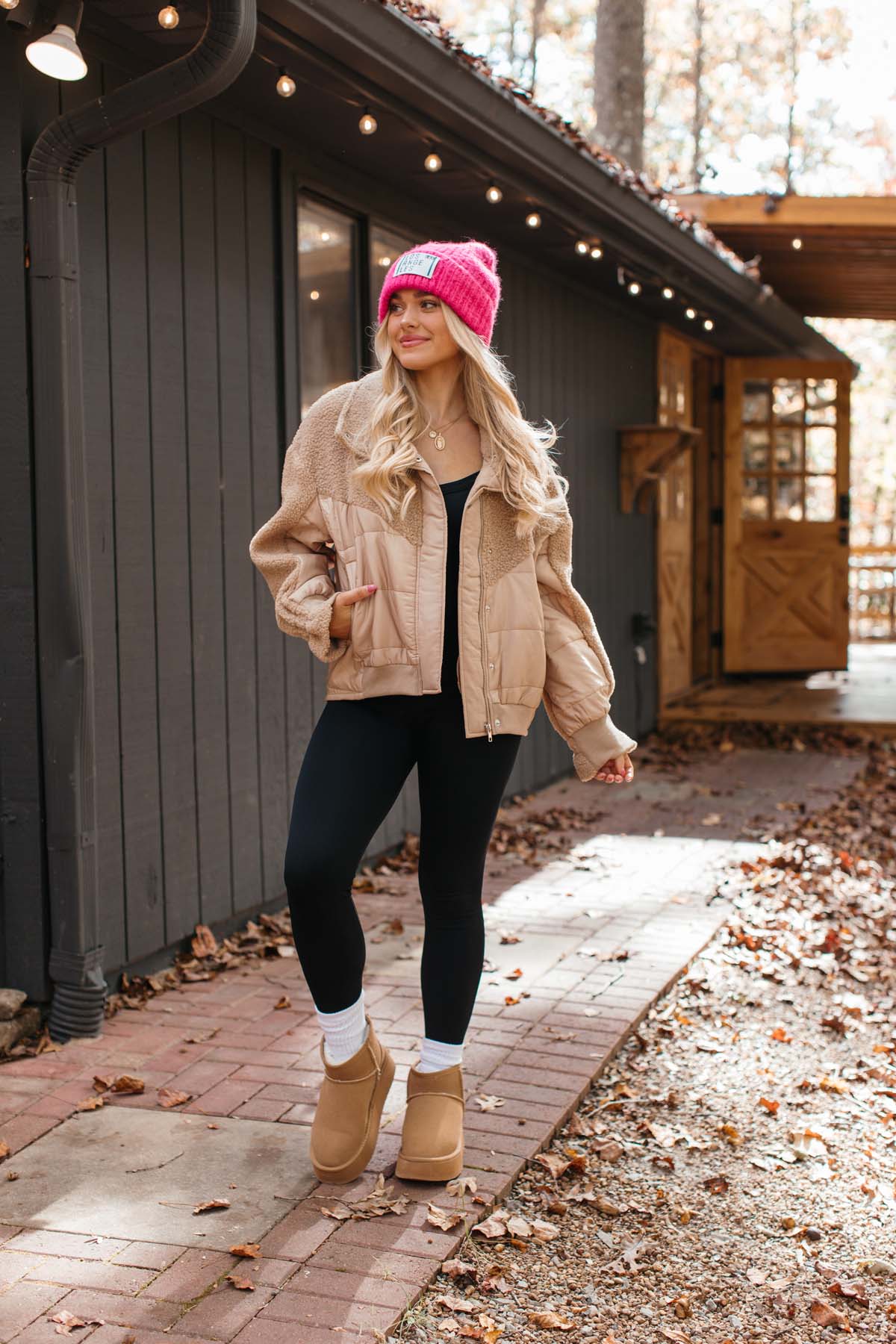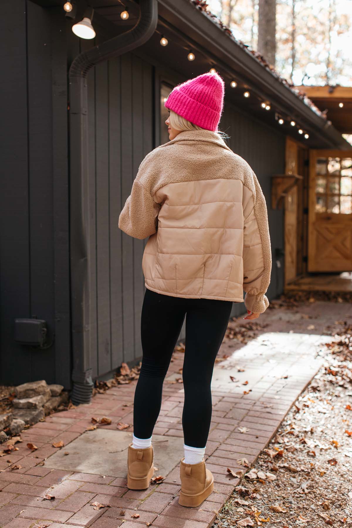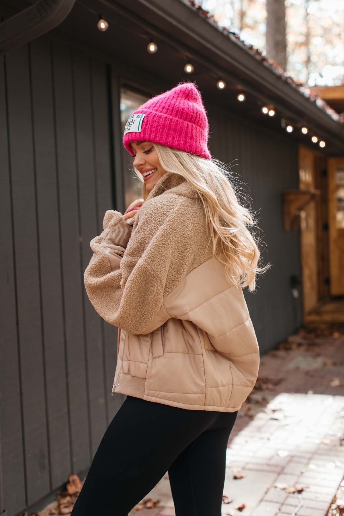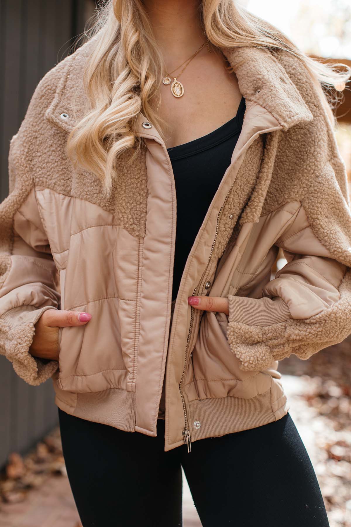 Our Ember Jacket features a zipper and button closure, two side pockets, and a cinched wrist cuff.