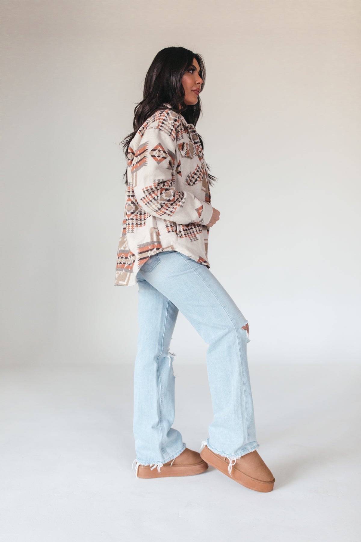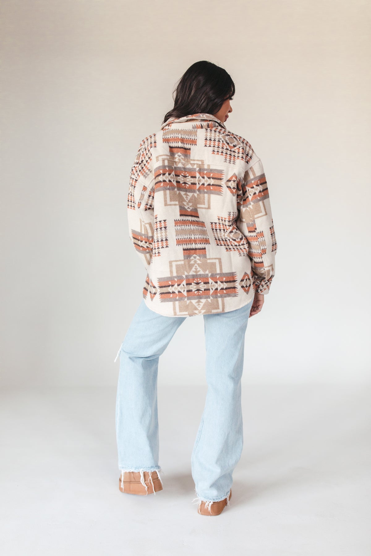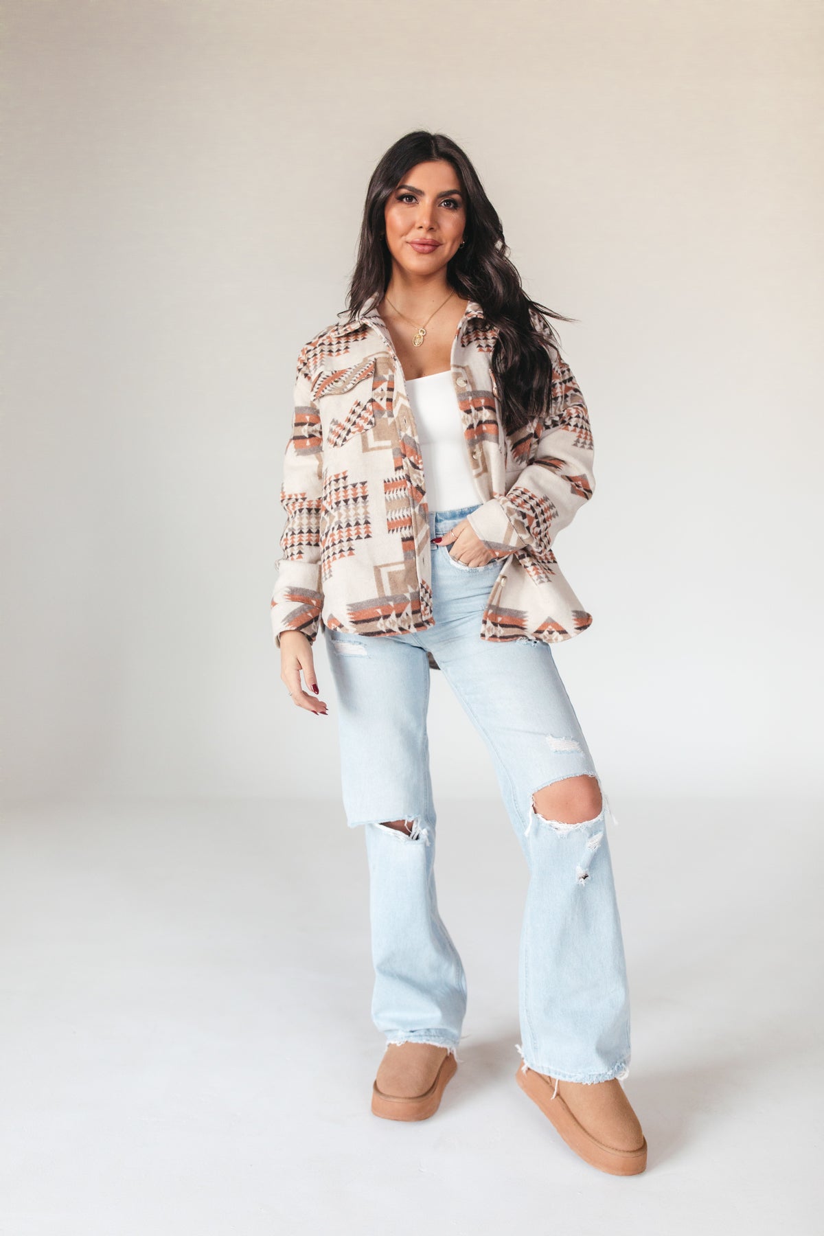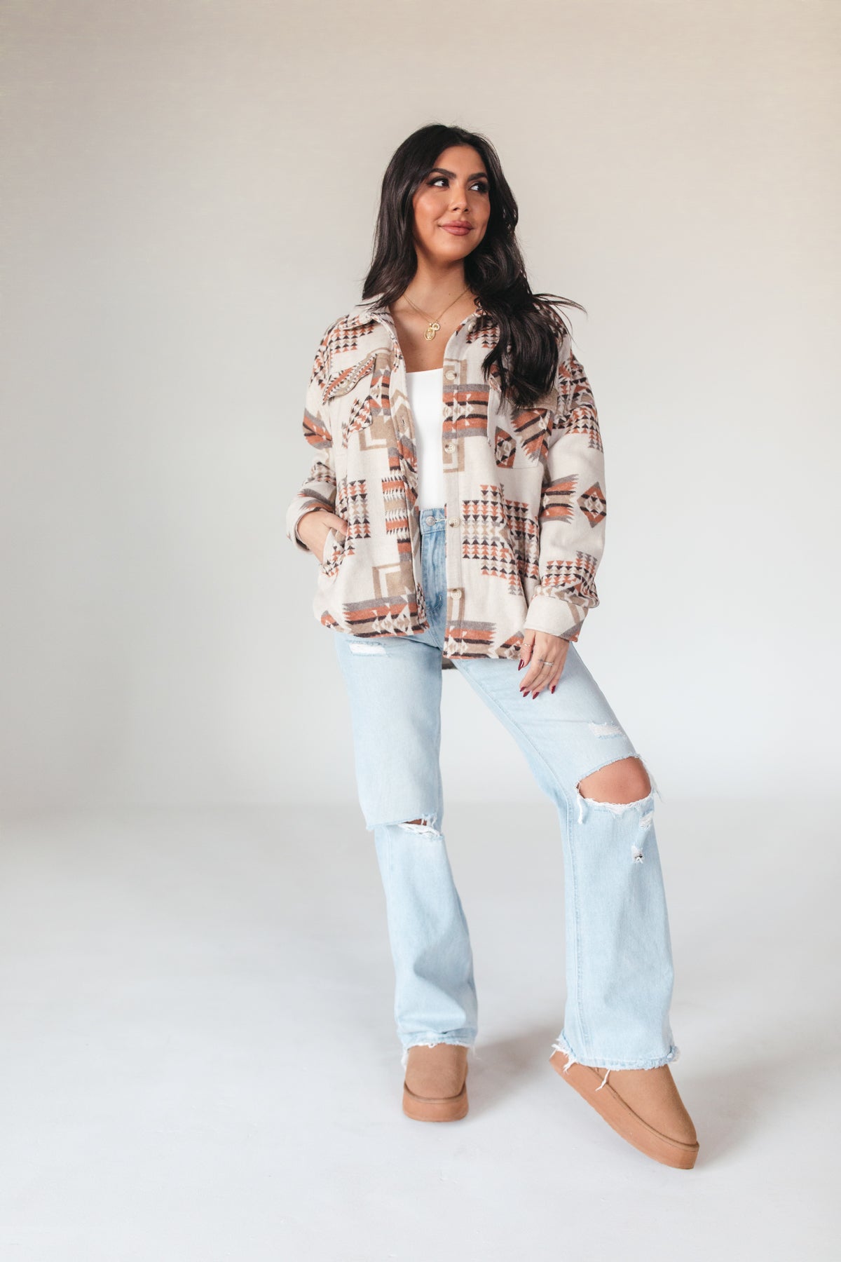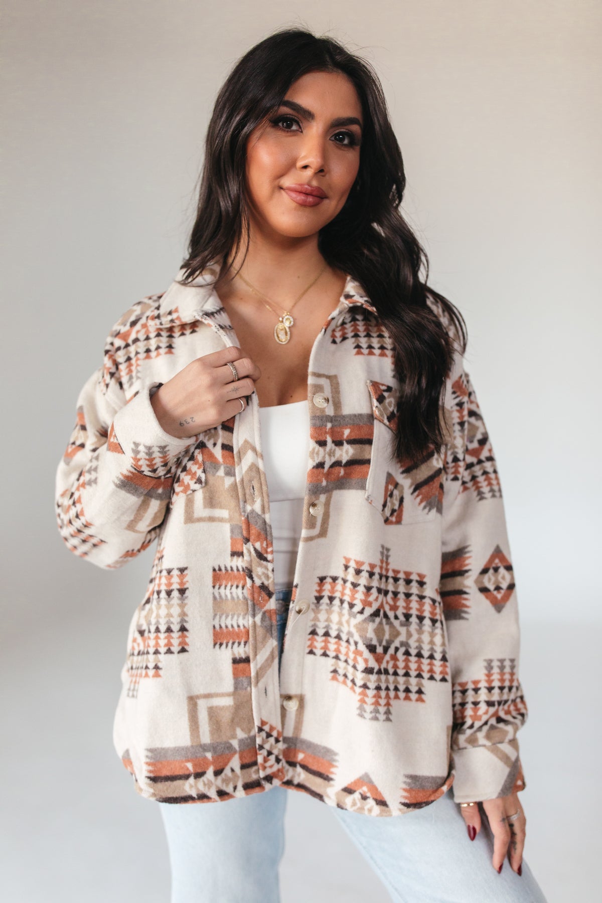 OurJuliana AztecJacket features a button-down closure, two front pockets, and an all-over aztec design.