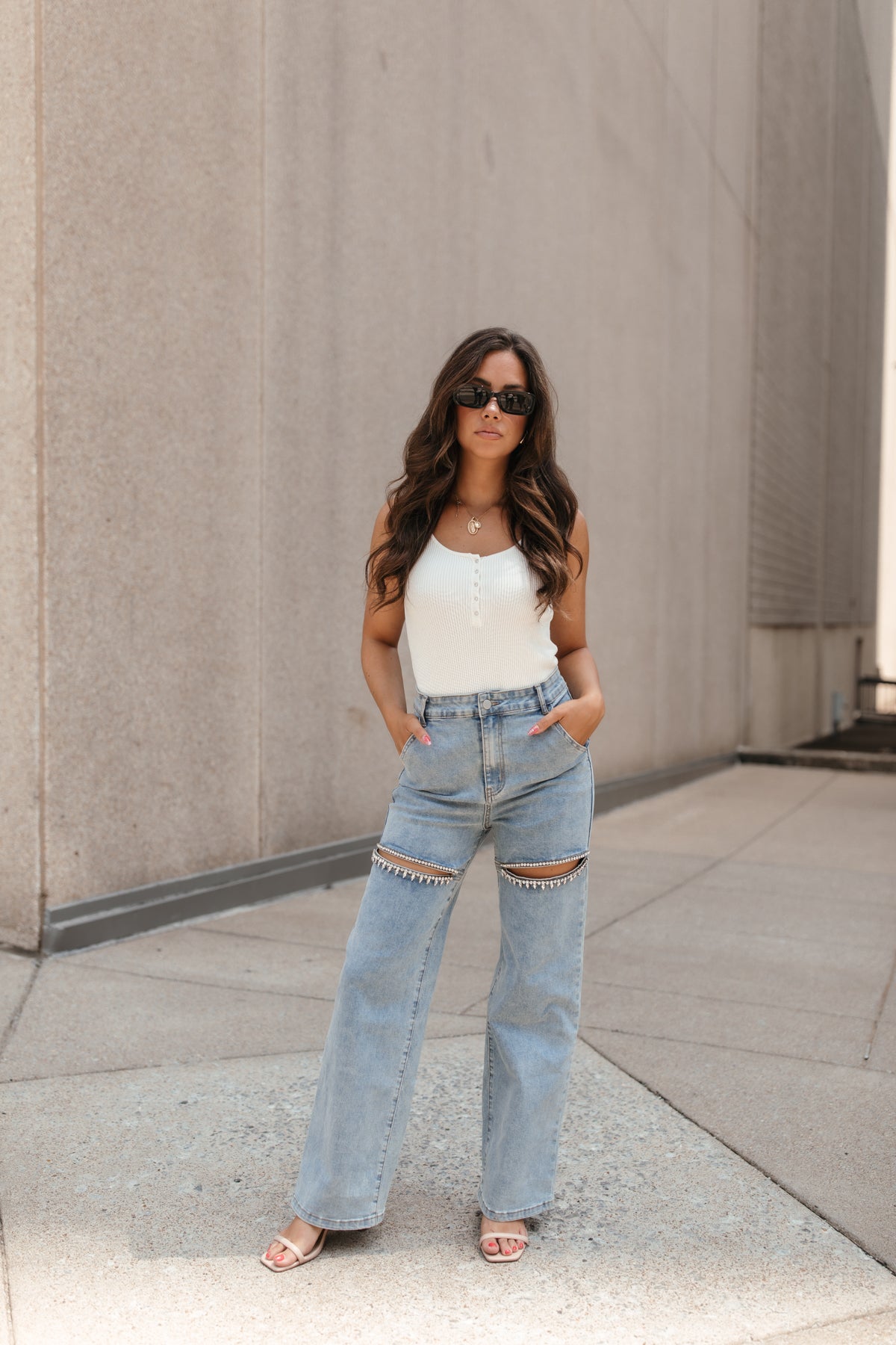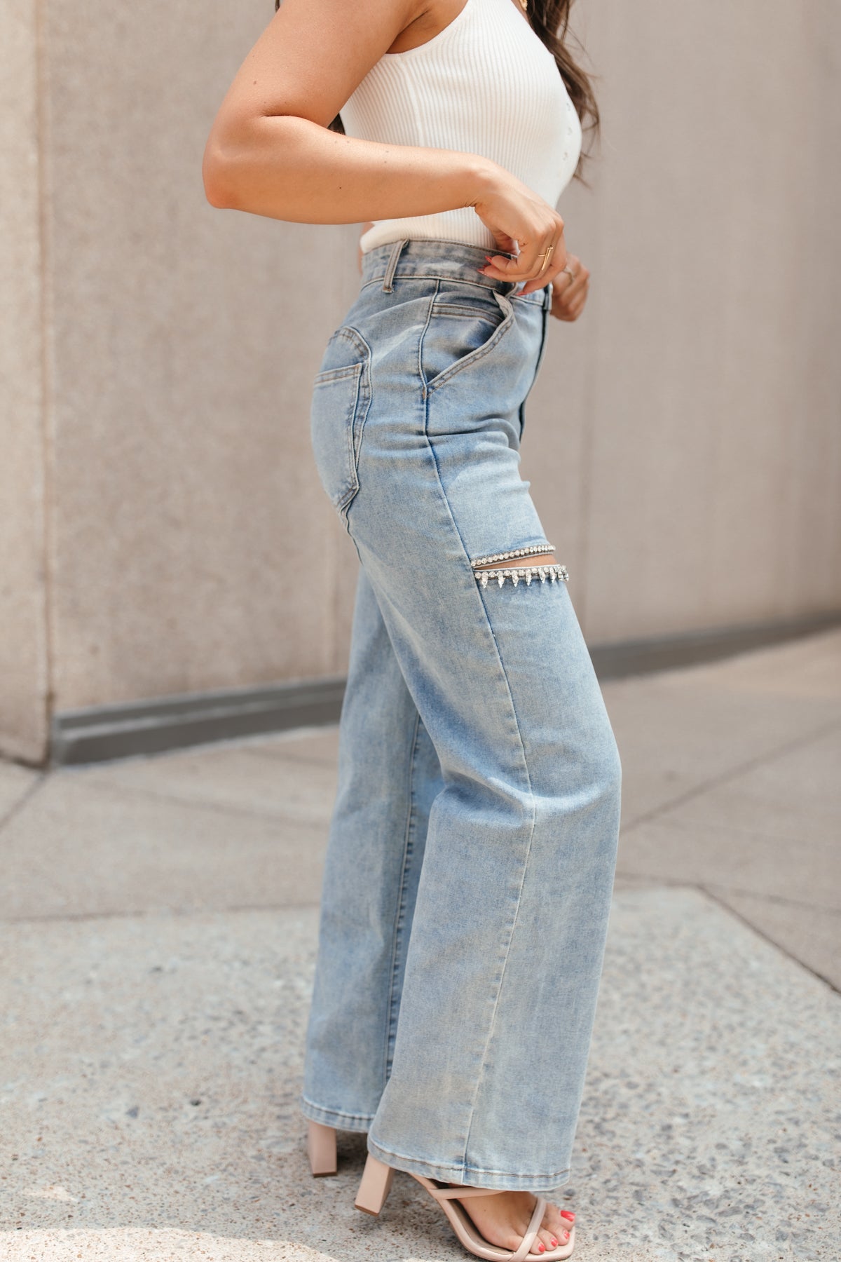 Our Kori Rhinestone Jeans feature a rhinestoned thigh slit, high waist, wide pant leg and a zipper and button closure.