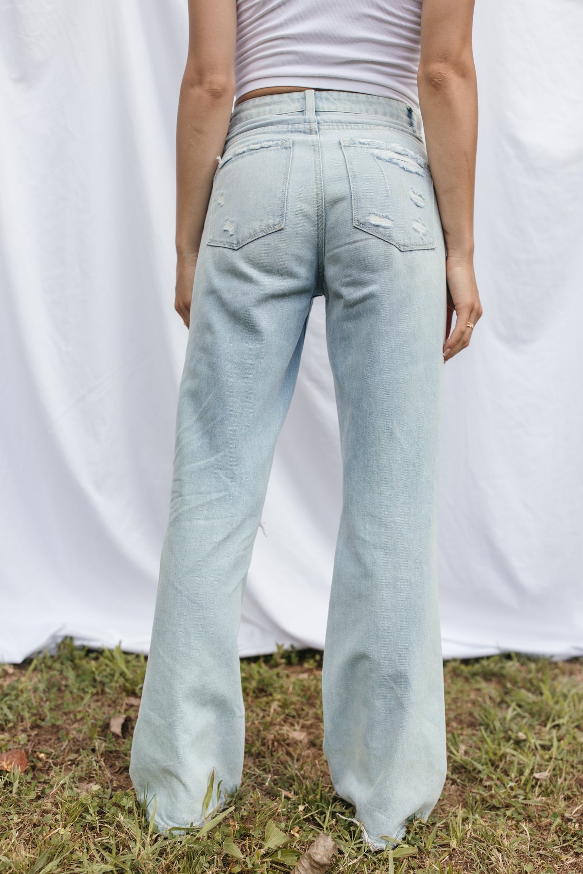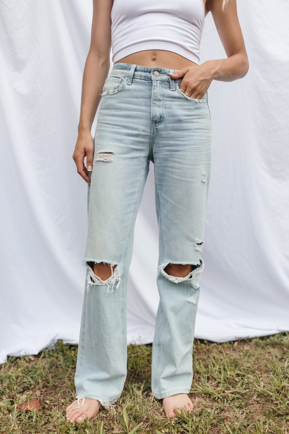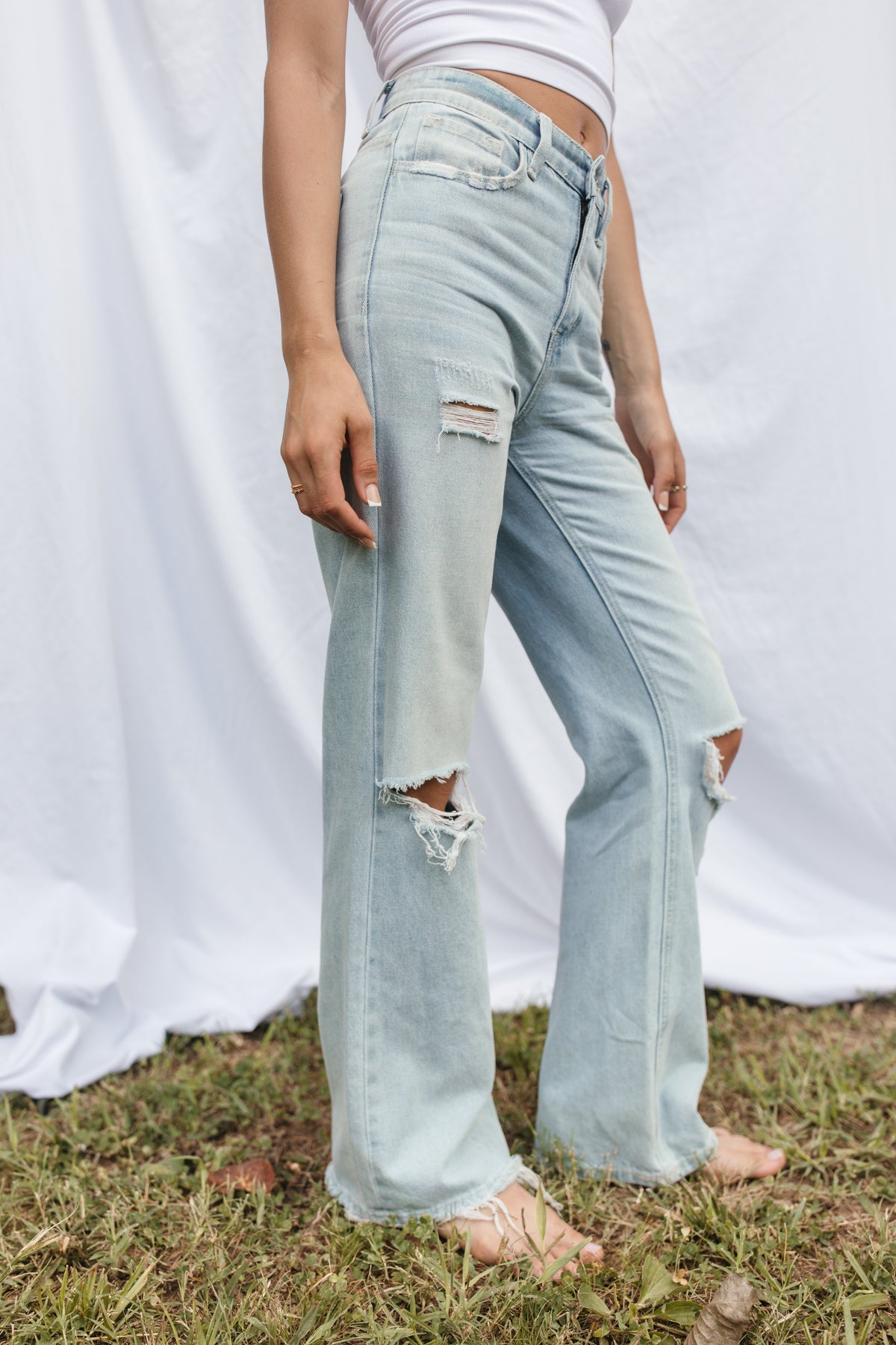 Our Marlowe Distressed Jeans feature wide pant legs and distressing at the knees.