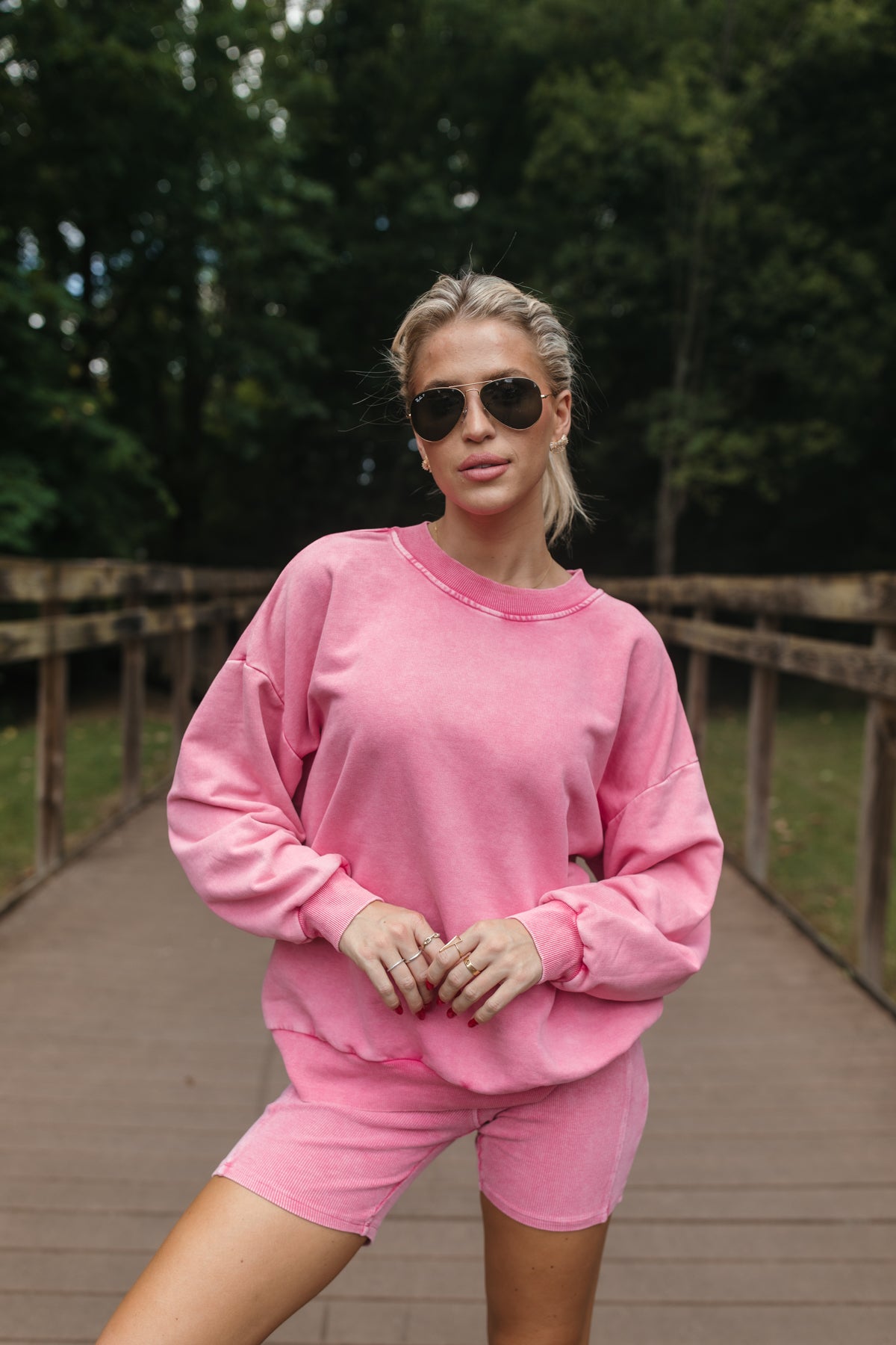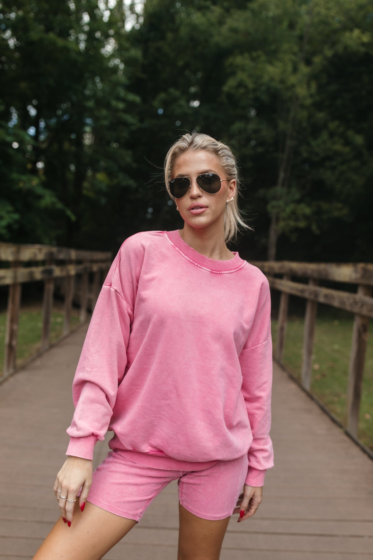 OurMason BubblegumSet includes acrewneck sweatshirtand ribbed biker shorts.