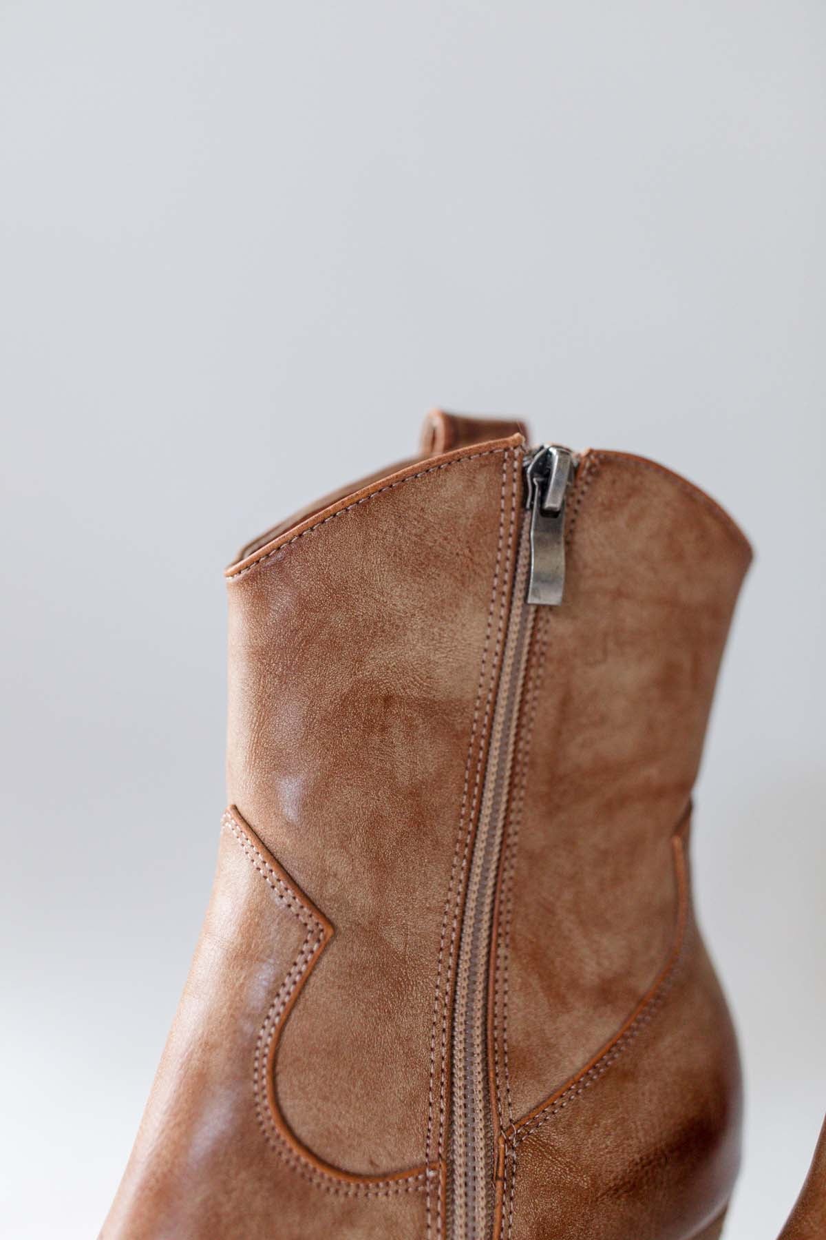 Our Ollie Tan Booties feature a side zipper and a square steel toe.
