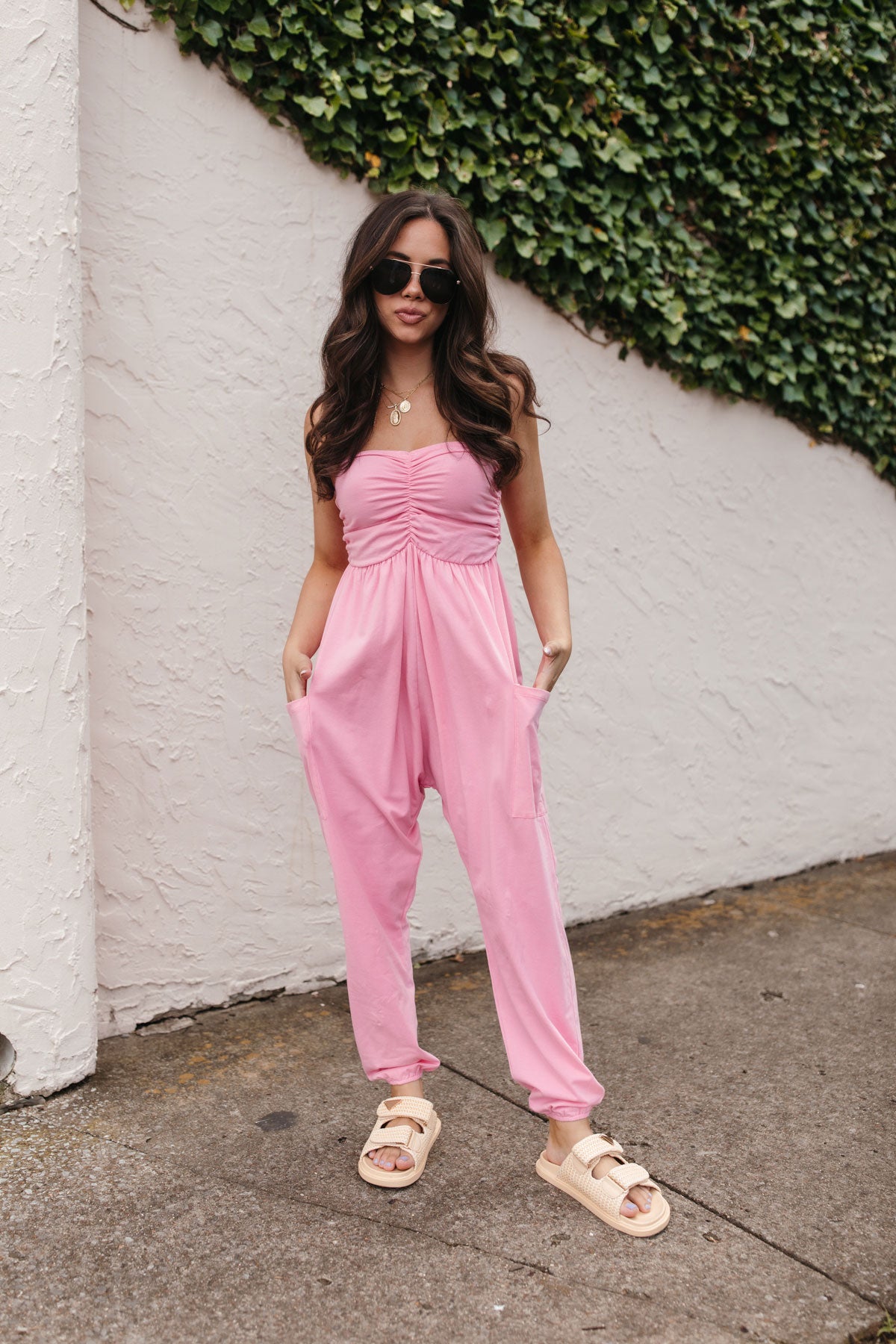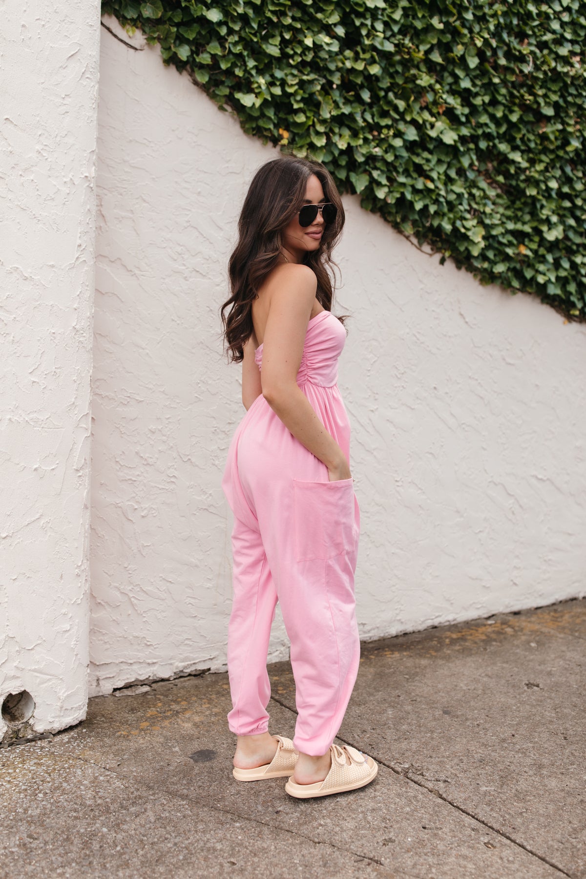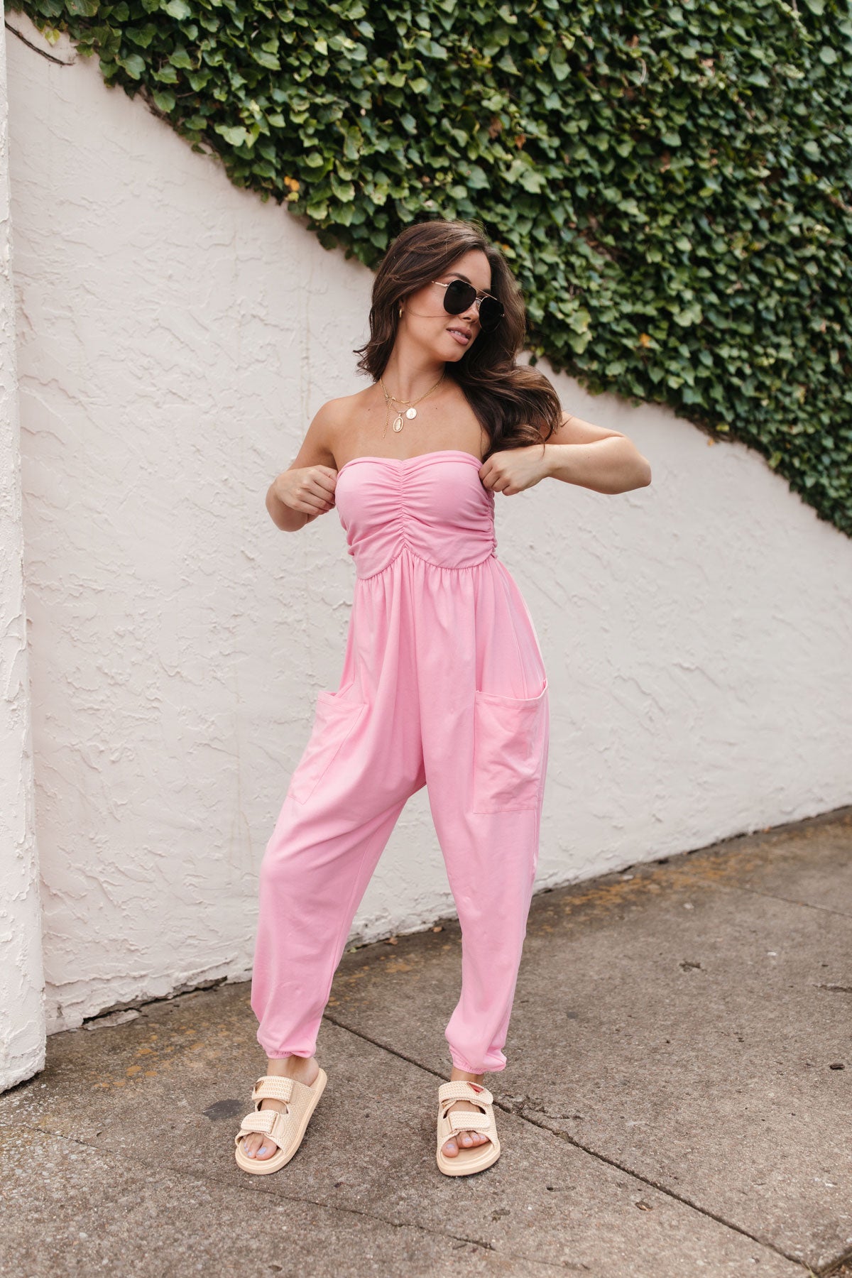 Our One & Done Jumpsuit features a jogger pant, side pockets, an elastic waist & a strapless top with ruched detailing.