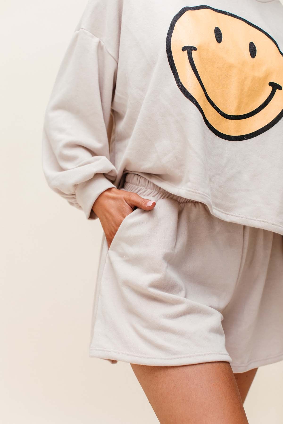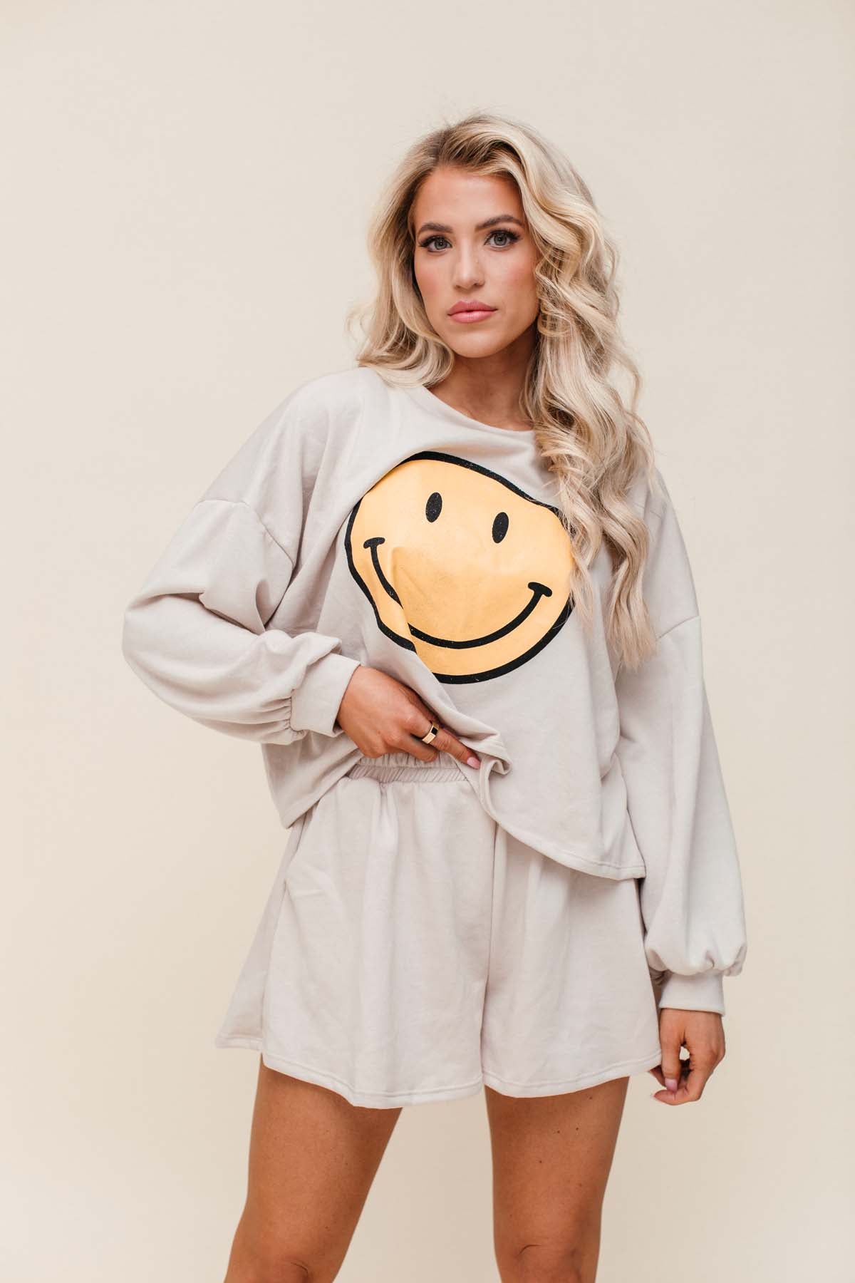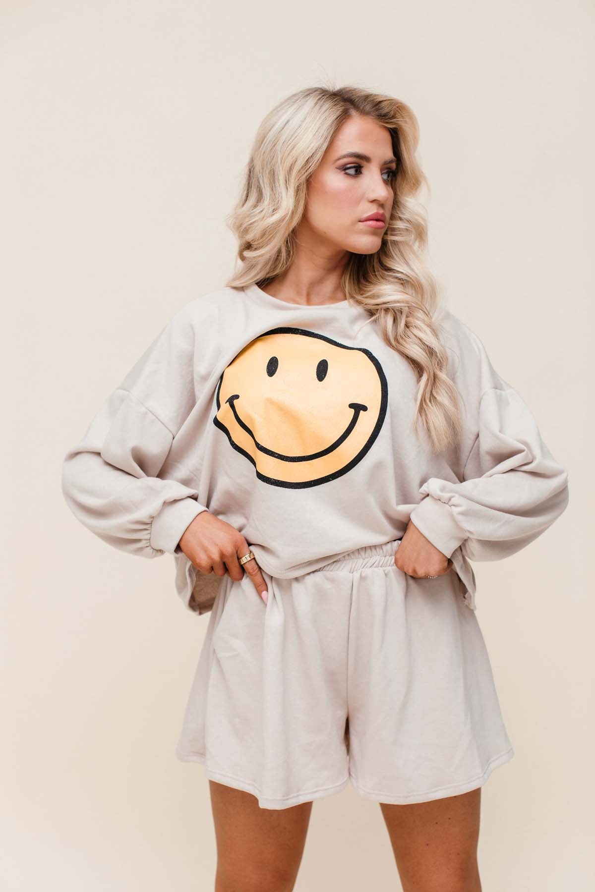 Our Palmer Smiley Set is the perfect way to show your sunny side! This versatile set includes a lightweight, long-sleeved top featuring a cute smiley face graphic, and a pair of comfy shorts. Crafted from a soft and breathable fabric blend, this set is perfect for lounging around the house or running errands. The elastic waistband provides all-day comfort. Plus, the fun smiley face adds a cheerful touch to any outfit!