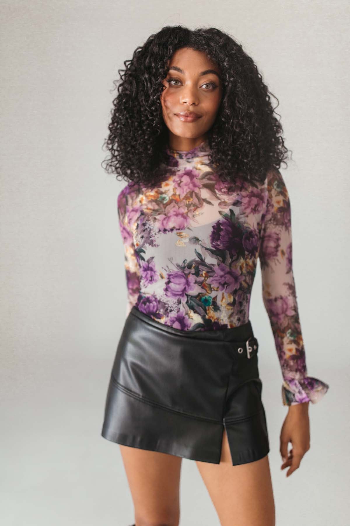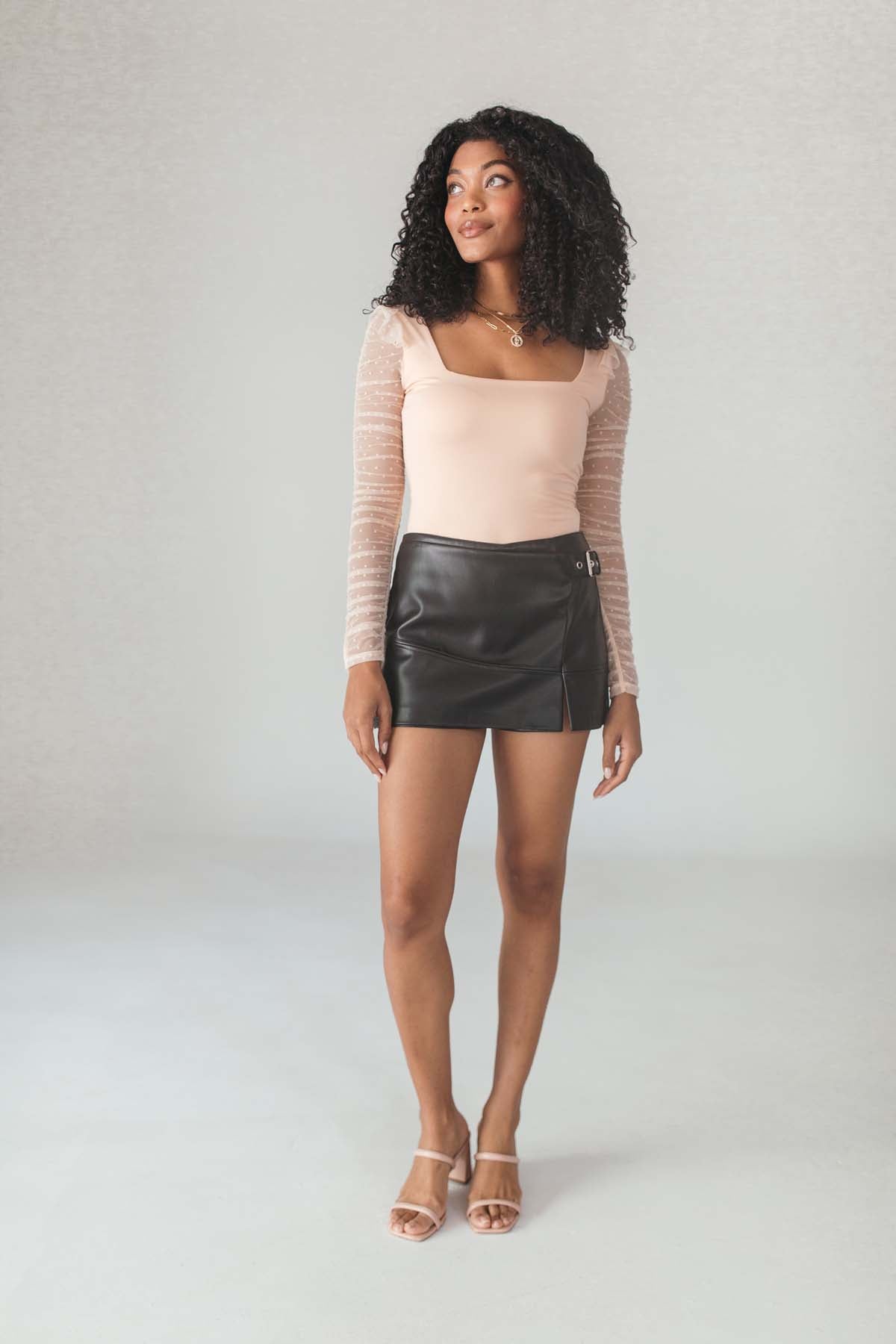 Our Sloane Faux Leather Skort features asmooth faux leather fabric and anasymmetric hem.