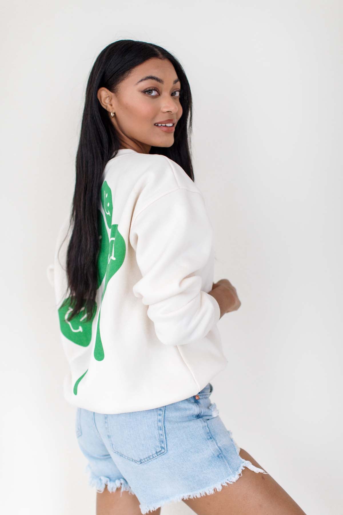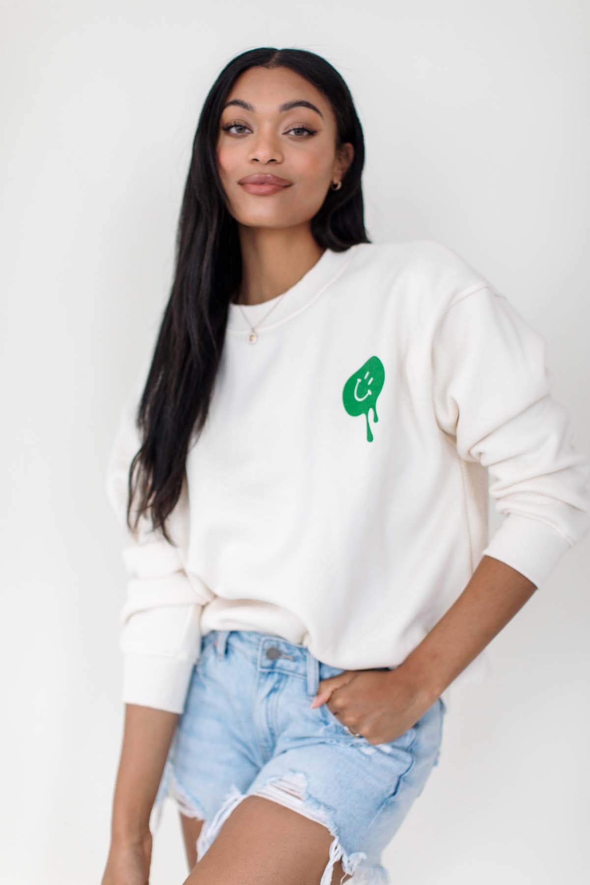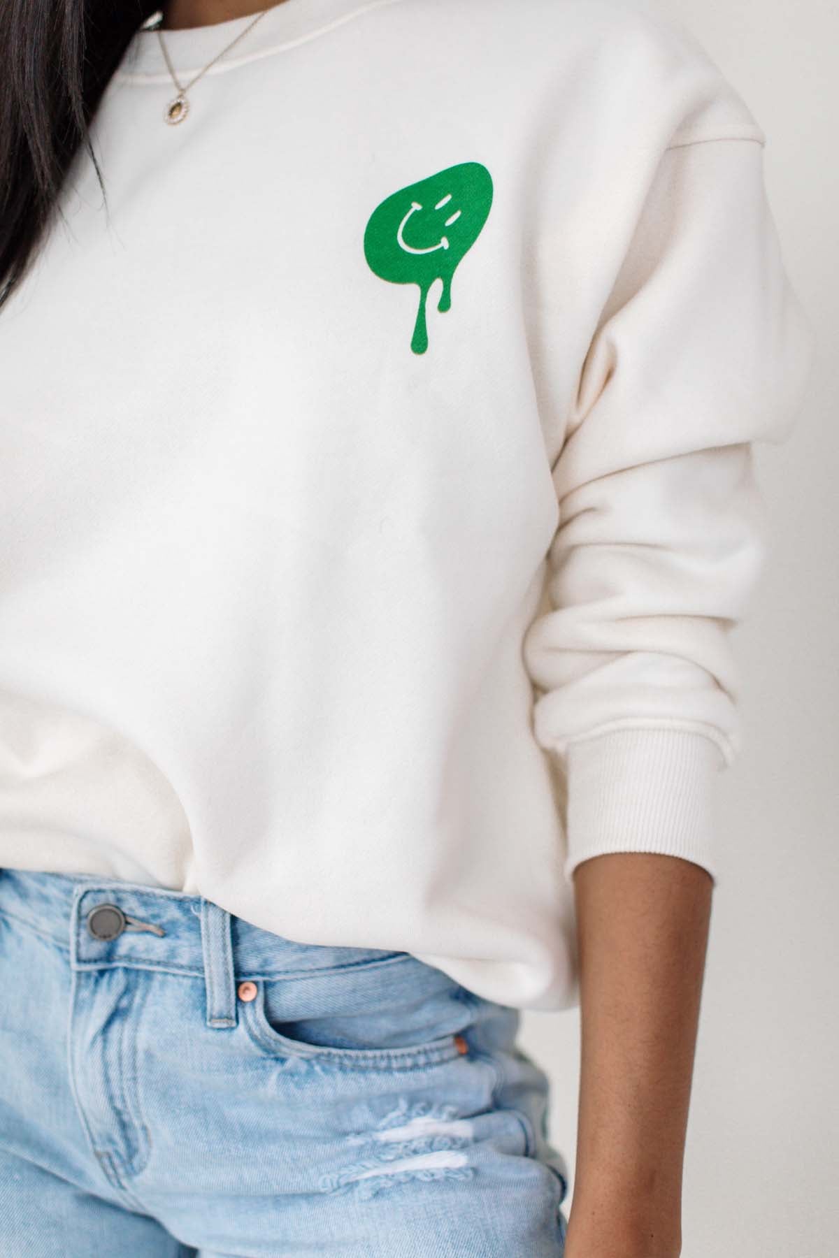Our Kelly Green Smiley Sweatshirt features a smiley graphic and ribbed hems.
