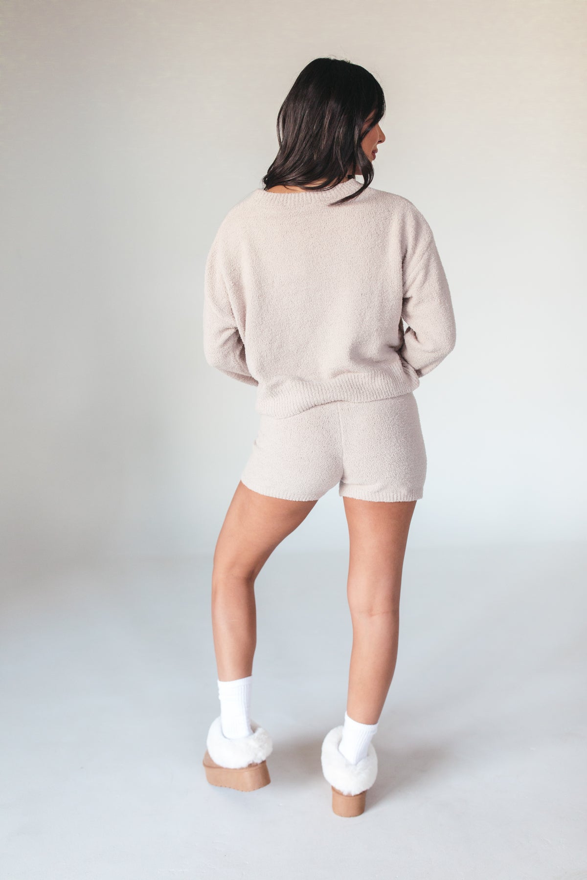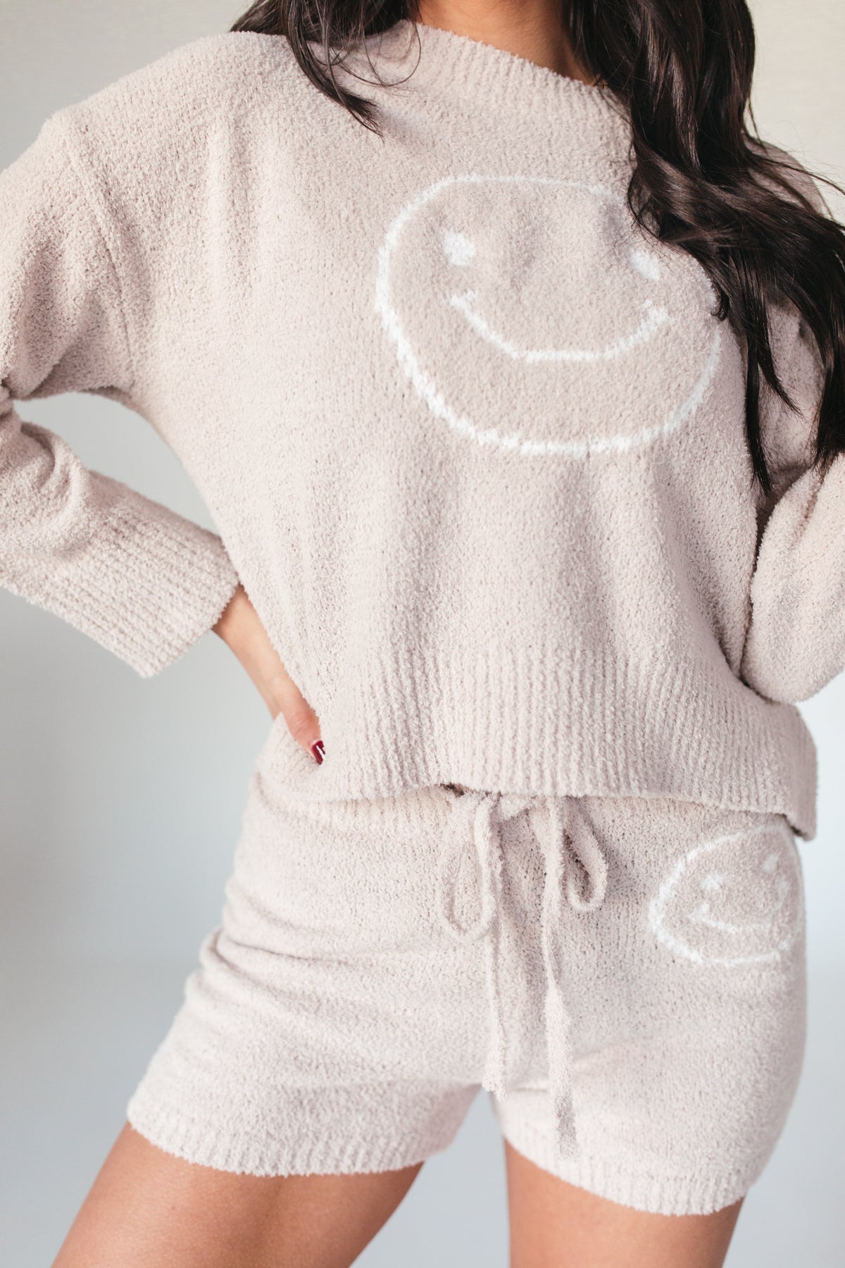 Our Taupe Cozy Smiley Set features a cozy long sleeve top with a smiley face and matchingdrawstring shorts.