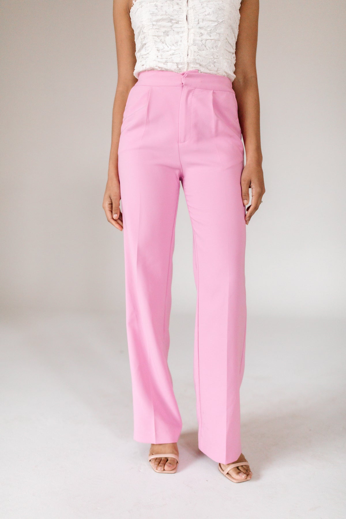 Our Tinsley Trousers features a wide pant leg with pleated details and a two-clasp and zipper closure.