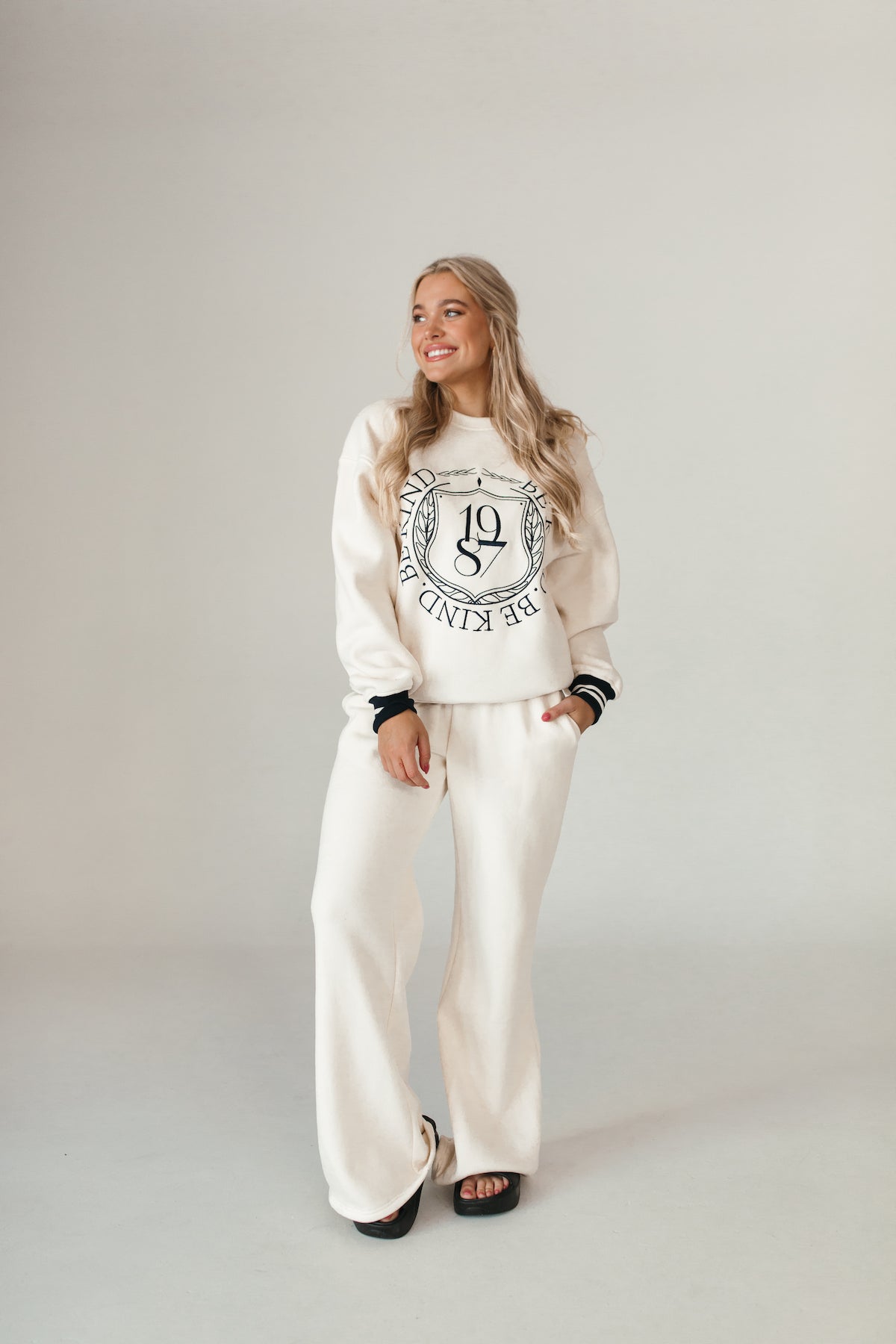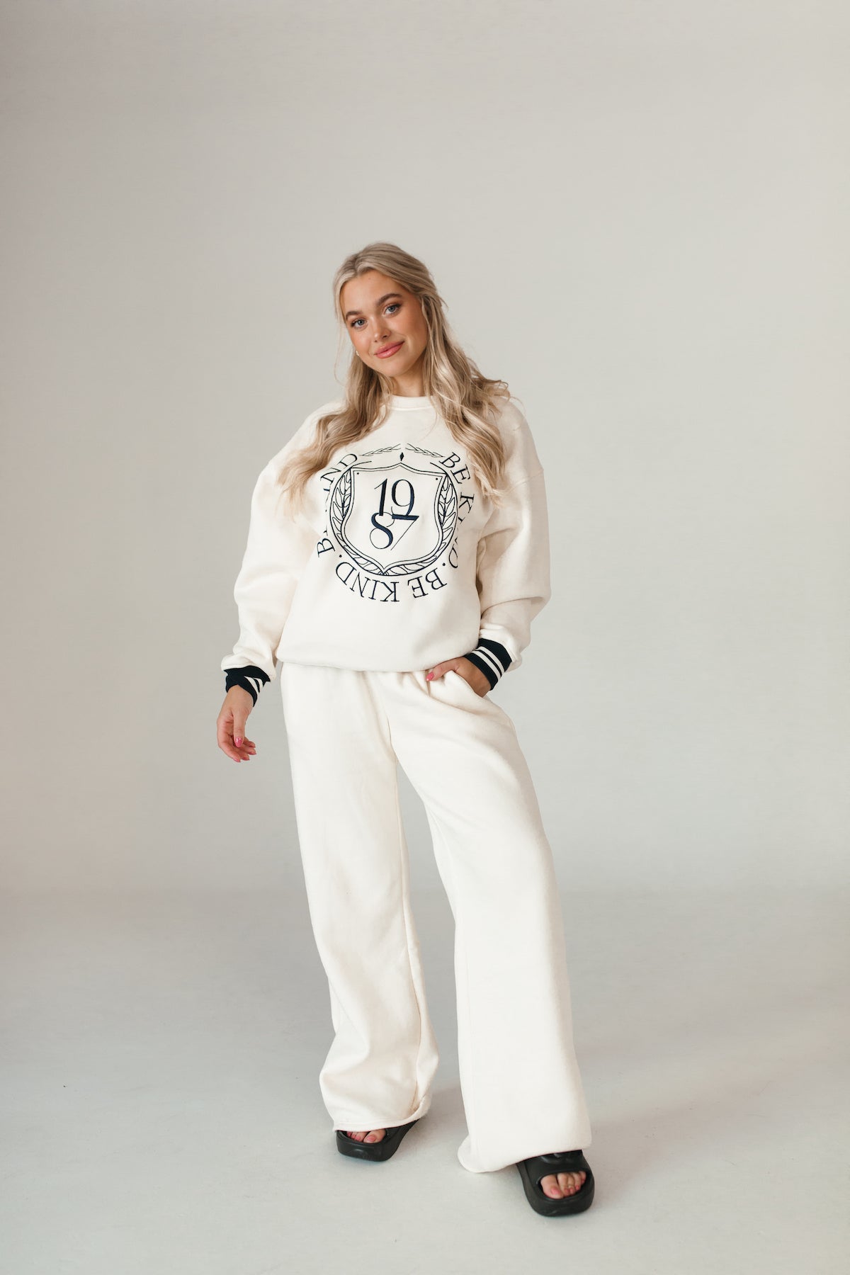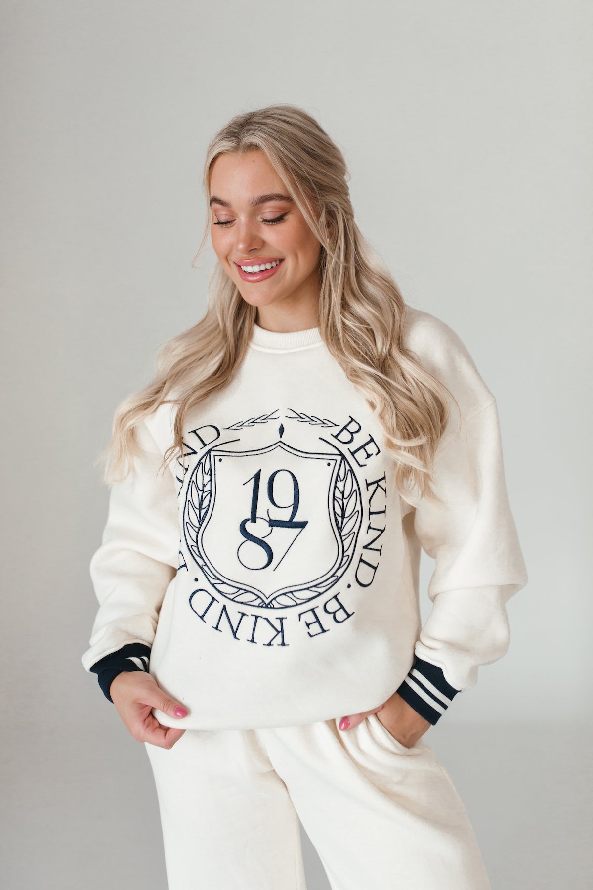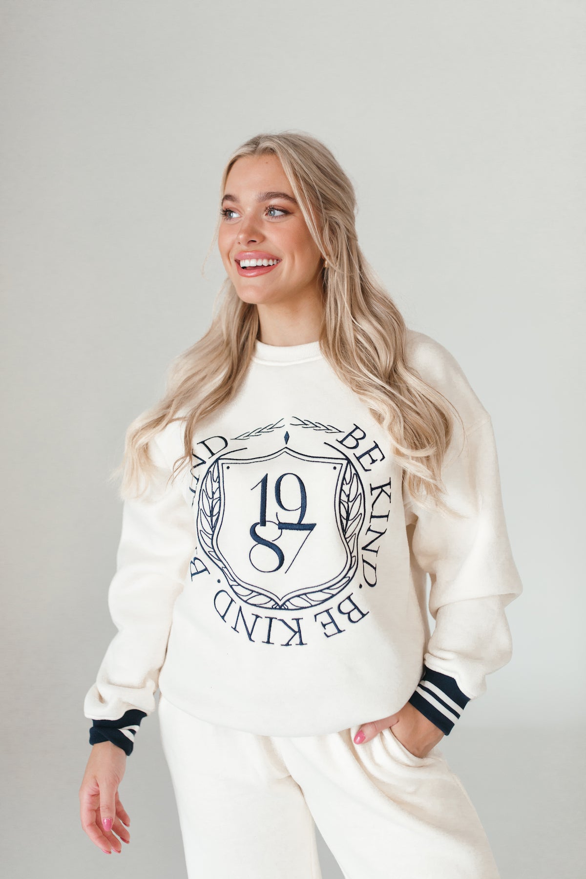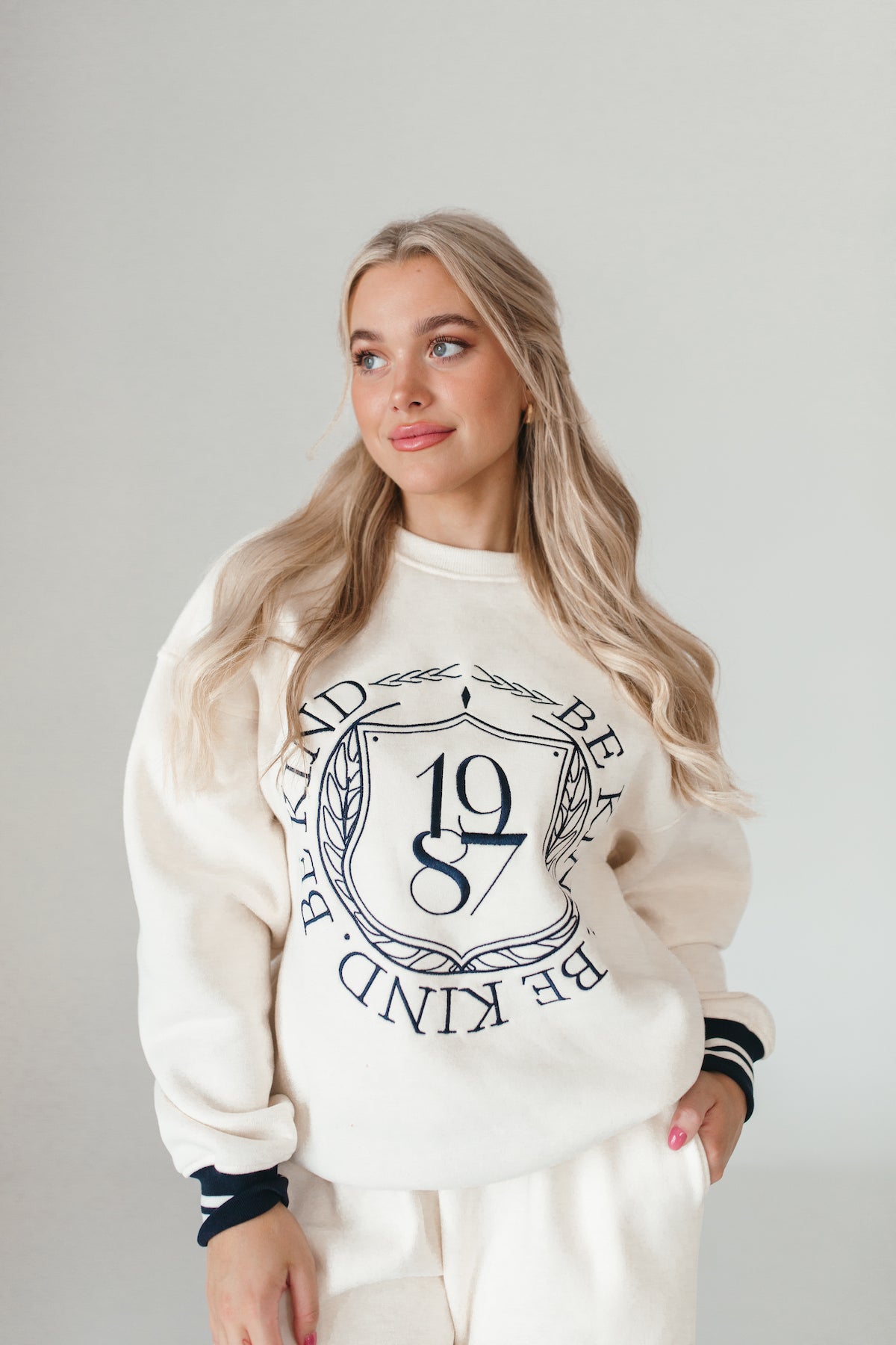 Our University Sweatshirt features Be Kind text and a varsitystripe on the hems.