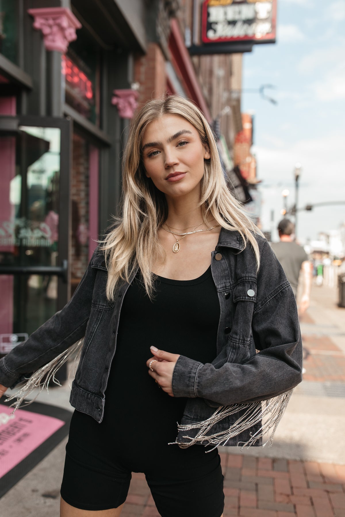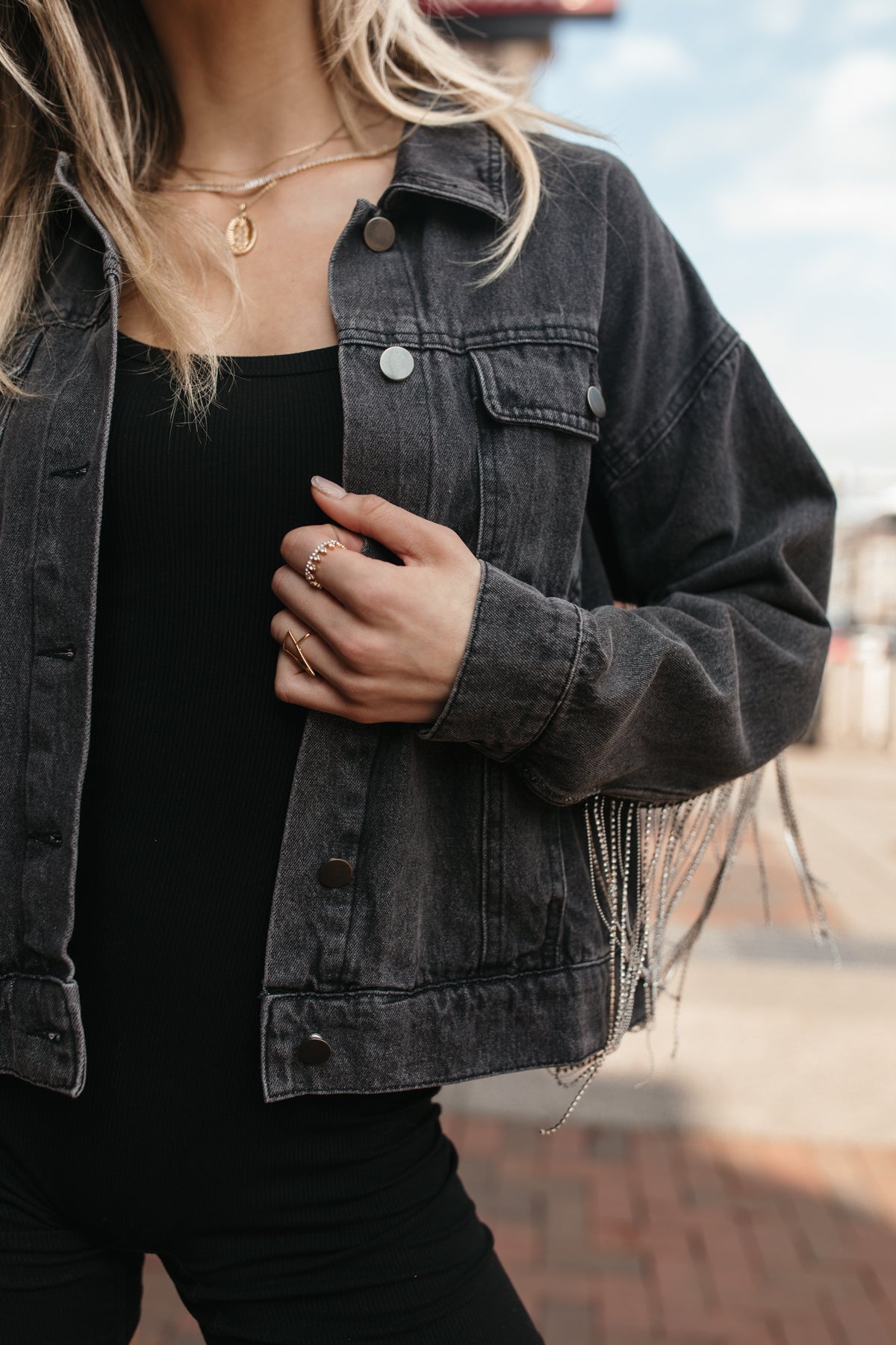 Our Delilah Black Washed Denim Jacket features abutton-down closure and rhinestone fringe design from sleeve to sleeve.